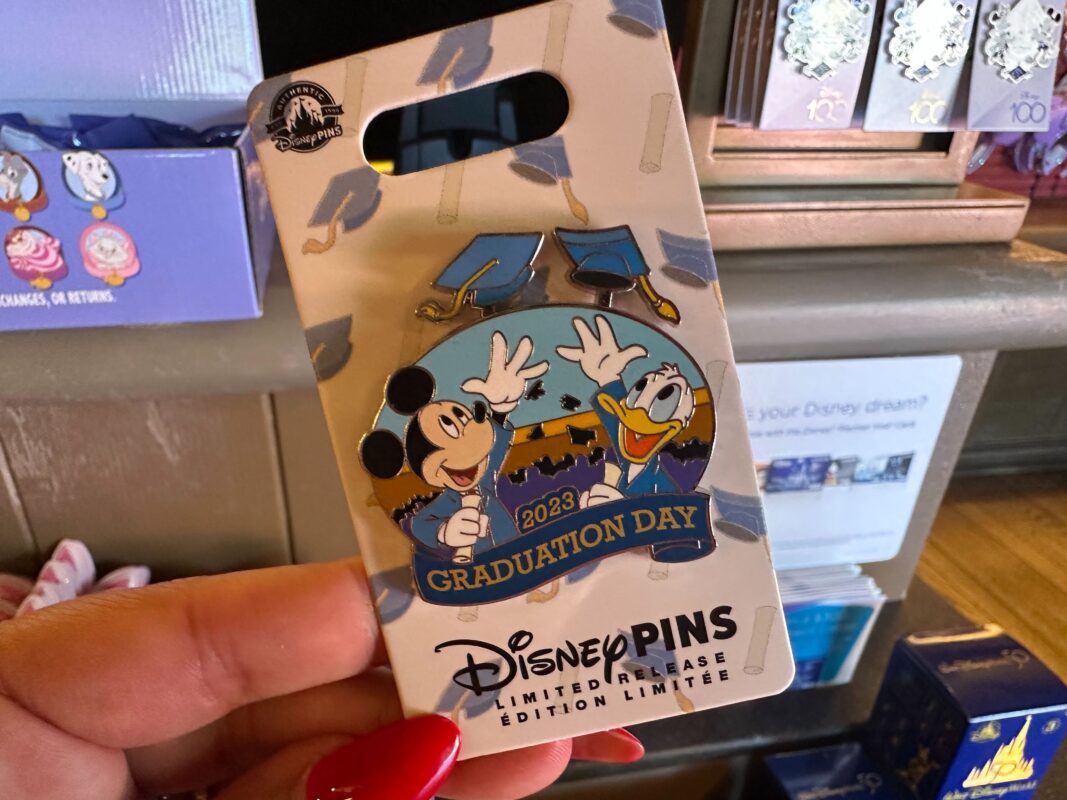 Cheer on the grad in your life with this 2023 Graduation Day Pin featuring Mickey Mouse and Donald Duck tossing their graduation caps into the air.