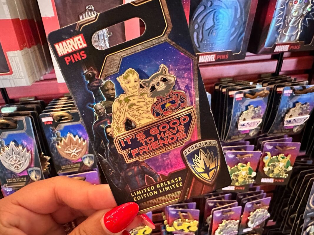 Another limited release pin for Guardians of the Galaxy reads “It’s good to have friends.” Groot and Rocket are featured.