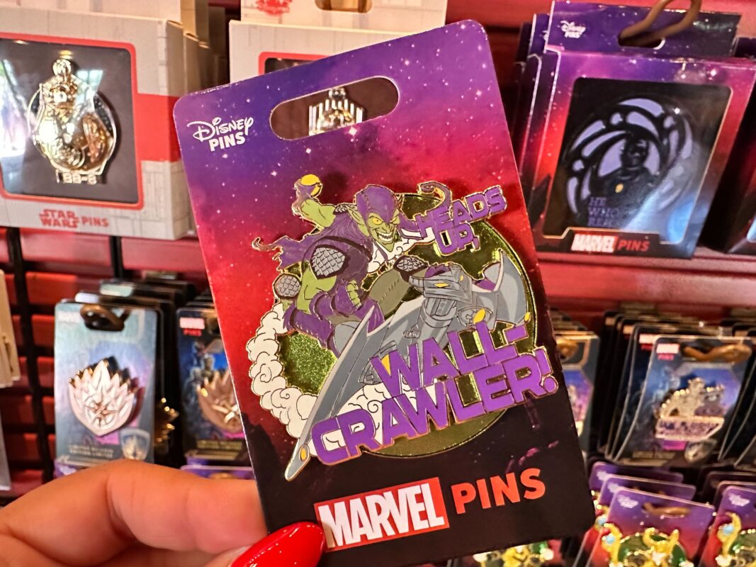 Watch out, Spider-Man. Green Goblin sails along on this Disney Villain pin that reads: “Heads up, wall-crawler!”