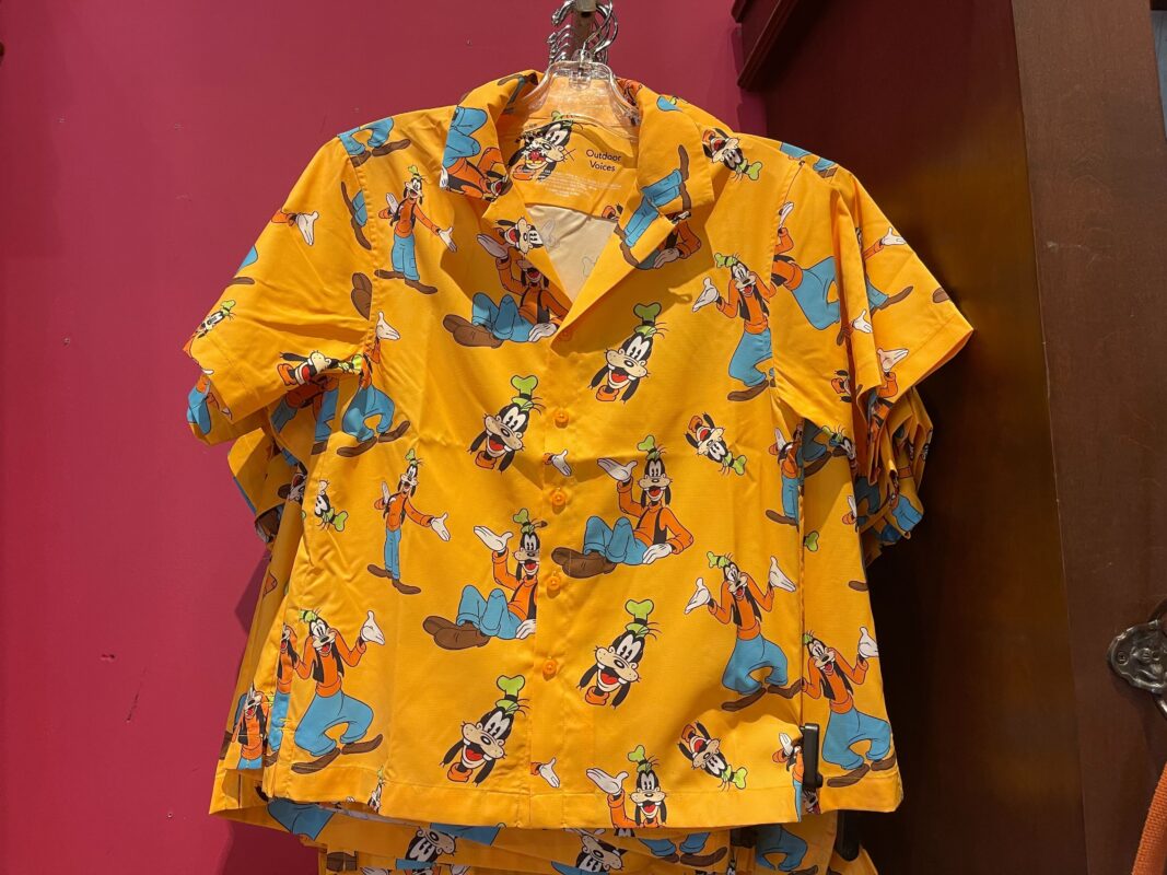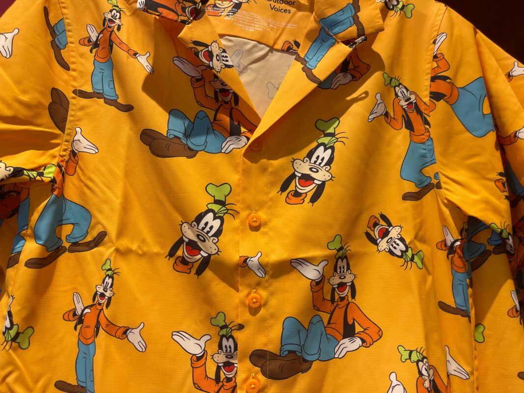 This button down short-sleeved shirt is made of performance fabric to help keep the wearer cool on hot Florida days. The pattern has a bright orange background with several images of Goofy posing, as well as Goofy’s smiling face.
