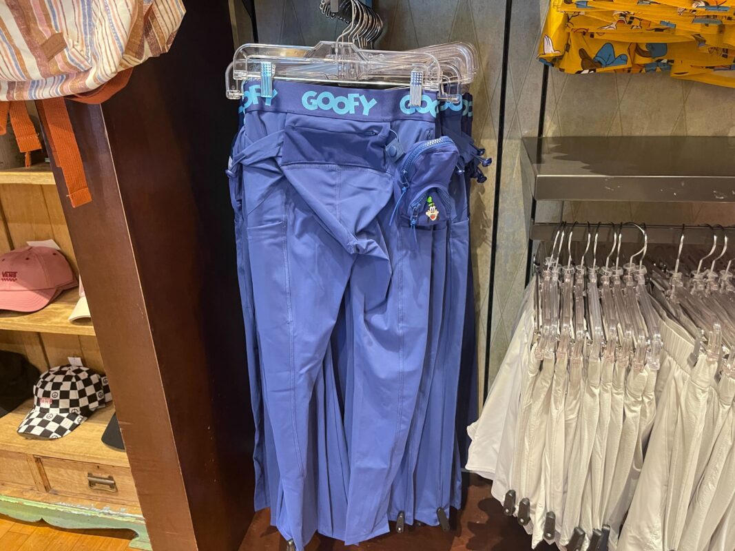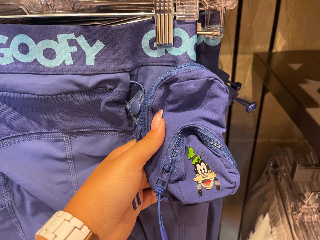 The waistband reads “Goofy” at intervals, and the attached pouch has a printed image of Goofy’s smiling face.