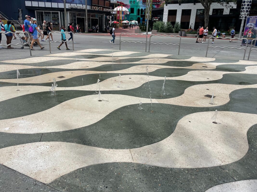 The splash pad is outside the Universal Legacy Store. The floor of it is made of wavy stripes. There are small metal railings around it.