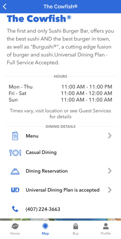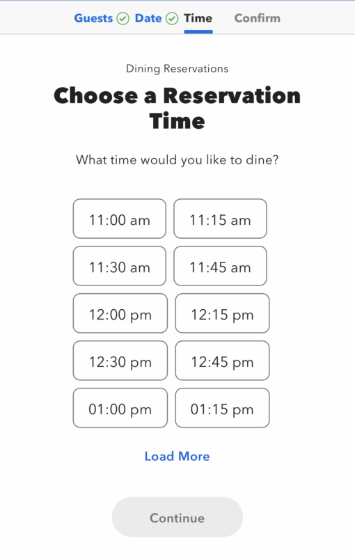 After selecting a restaurant (we chose The Cowfish), click on “Dining Reservation.”