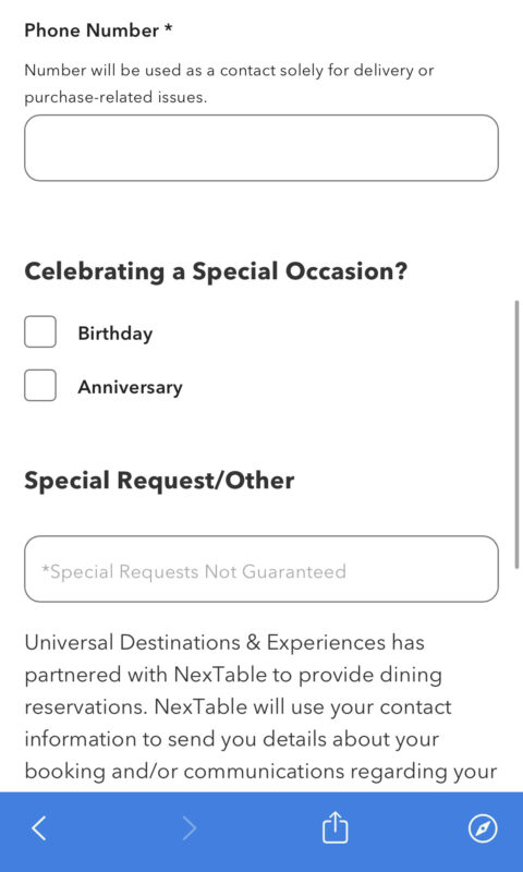 On the same page, you’ll be asked to provide a phone number. You can also select birthday or anniversary as a special occasion and write in special requests.