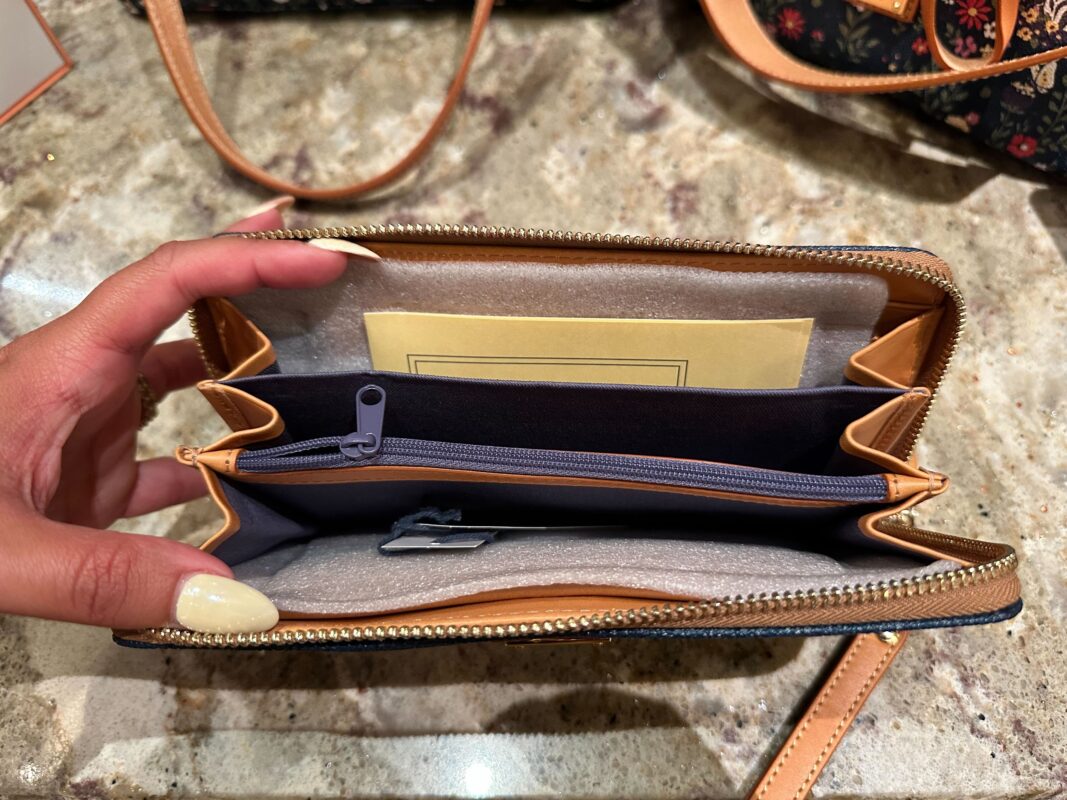 The interior lining of this bag is dark blue and the item is stuffed with the Dooney & Bourke logo tissue paper. An interior pocket is available.
