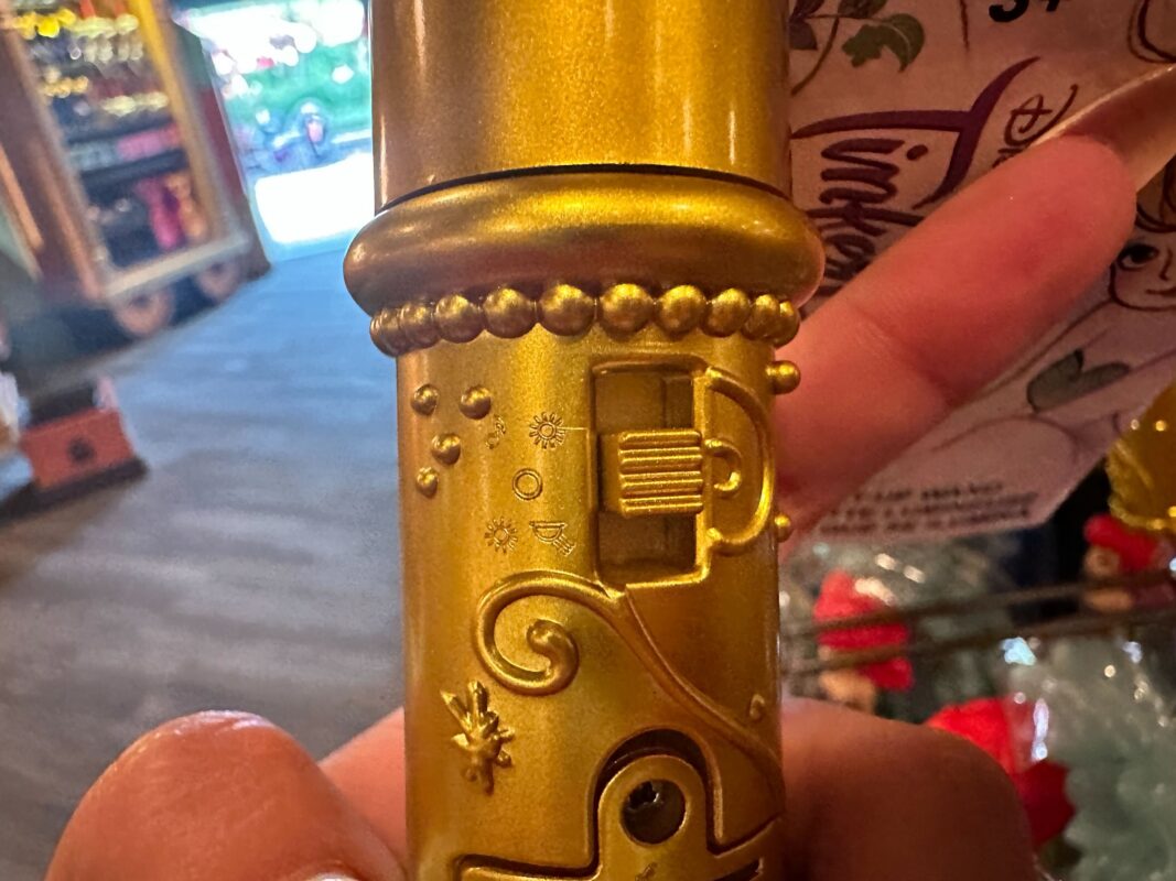 A switch on the back powers the wand’s different features, switching between the lights and the projections. The wand flashes when the switch is in the down position and lights up with accompanying Pixie Dust sound effects when it’s in the topmost position.