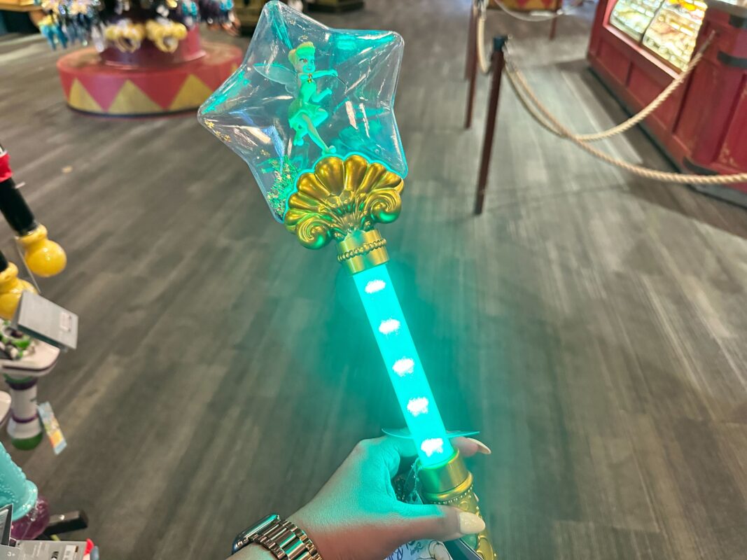 A new toy for Tinker Bell fans is available at the Emporium Shop in Magic Kingdom — a light-up wand featuring sound effects and the playful pixie inside a clear plastic star.