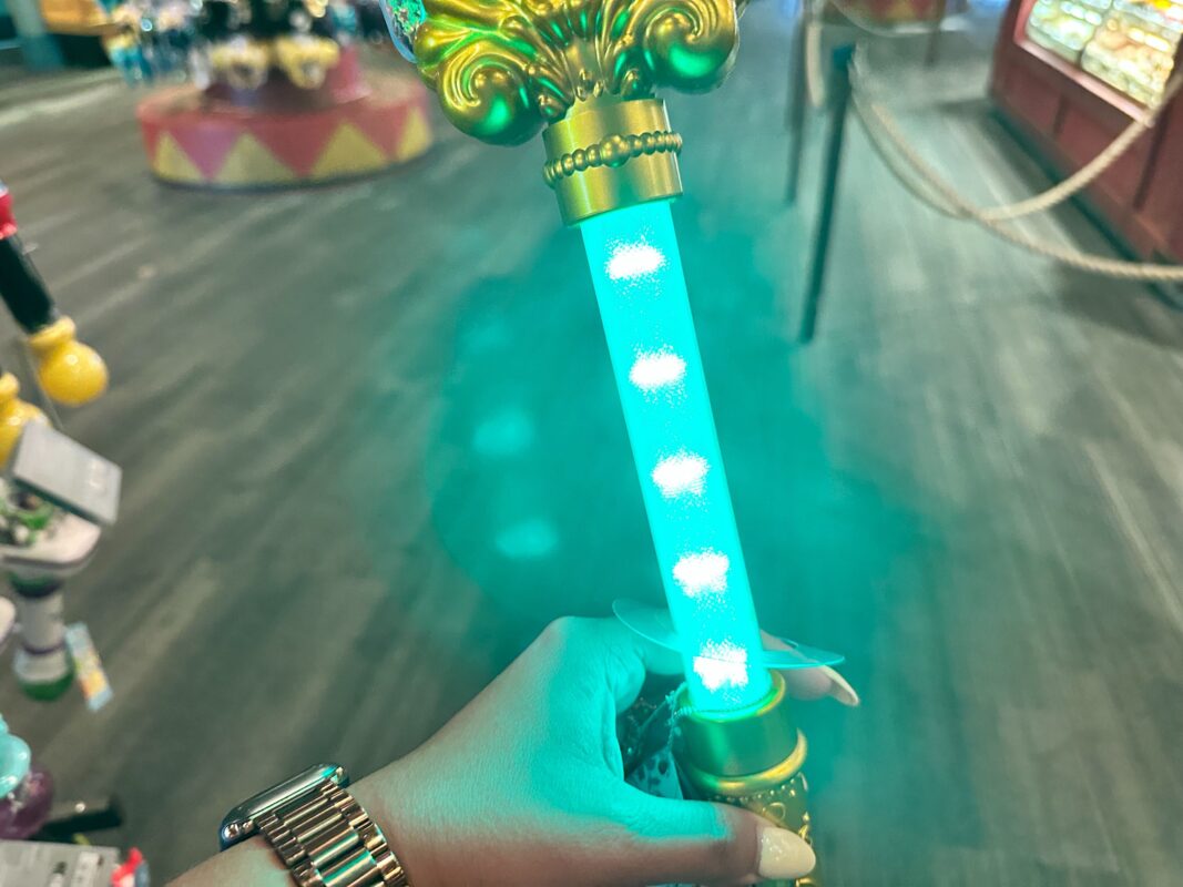 The wand’s shaft has a green sparkle pattern, which is clearly visible when the lights are off.