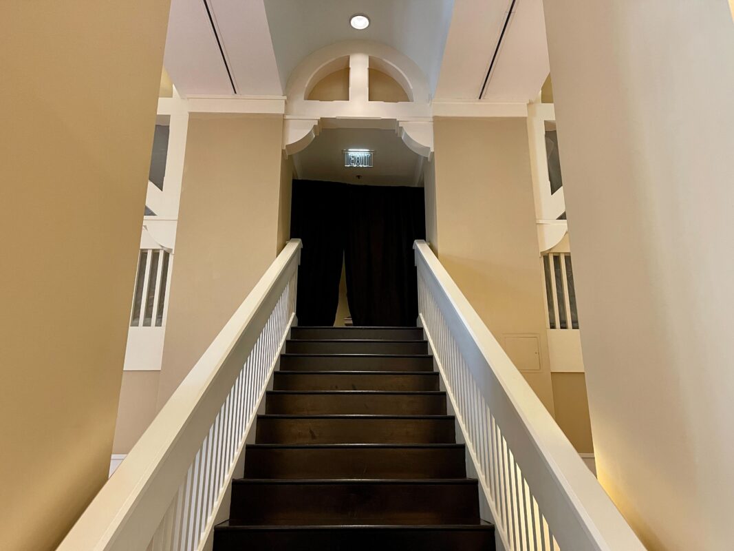 A black curtain hangs at the top of the stairs to prohibit guests from entering the workspace.