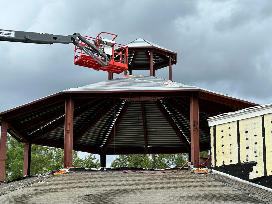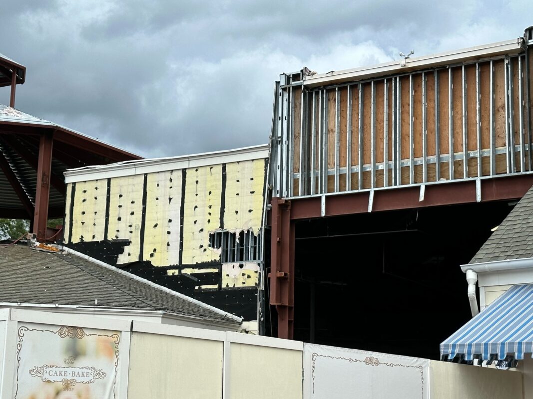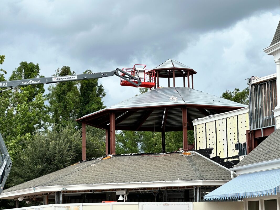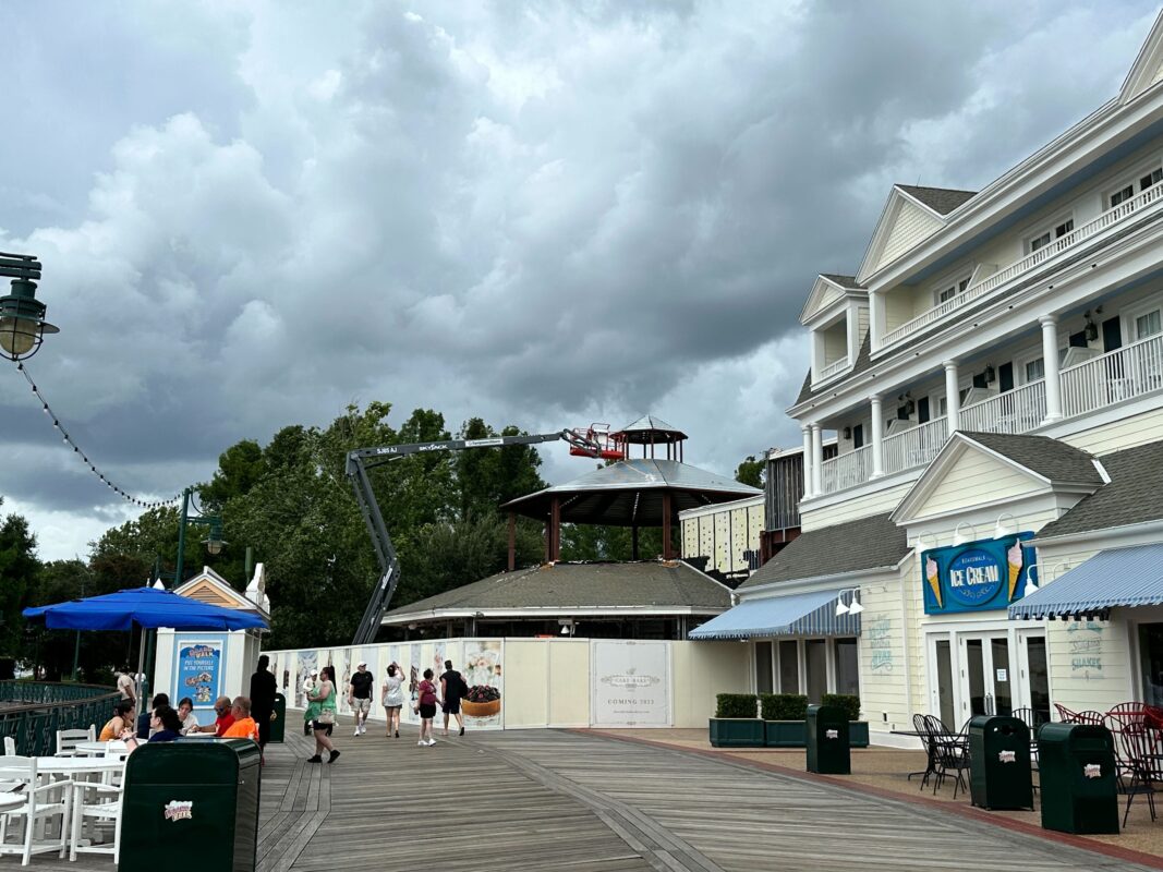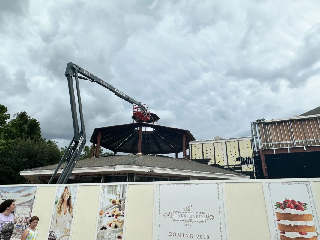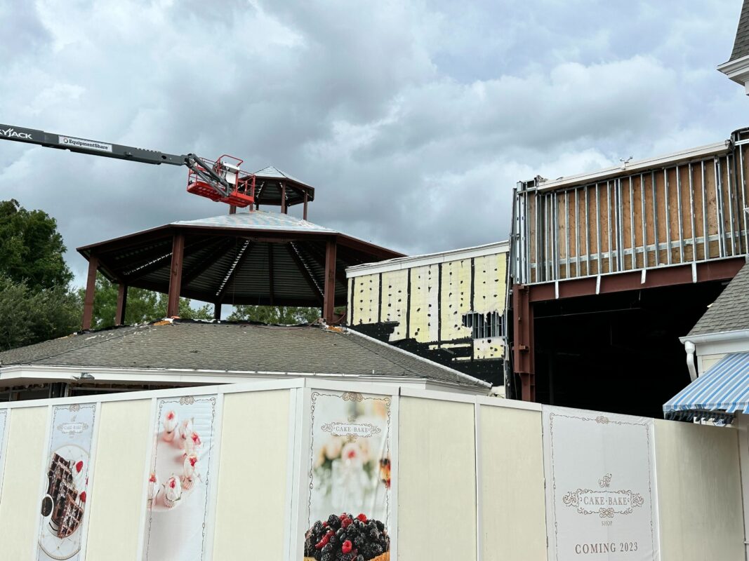 The construction near Disney’s BoardWalk Resort shows the upcoming bakery will have a gazebo-like appearance. The building was once home to ESPN Club, and while the basic shape will remain the same, many of the walls and the tower were demolished for the re-theming.