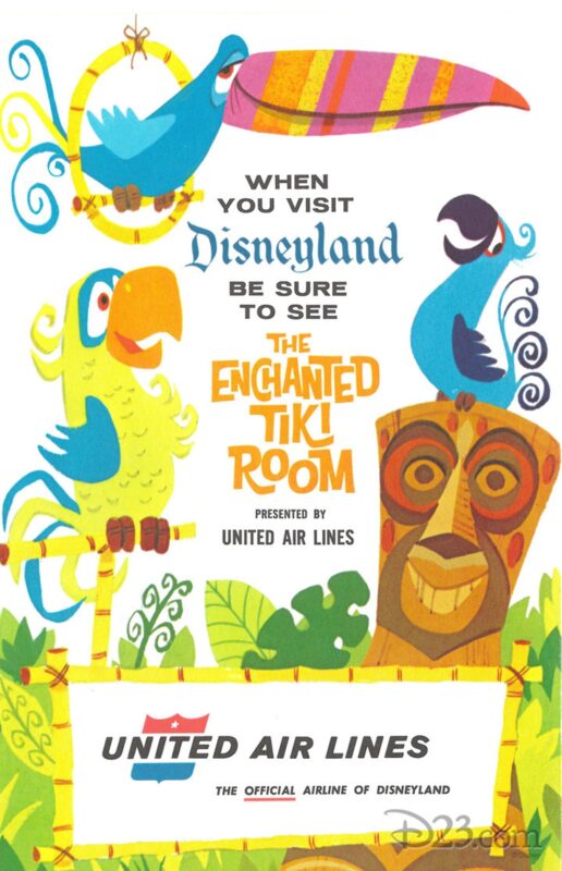 Walt Disney’s Enchanted Tiki Room opened on June 22, 1963 sponsored by United Airlines. Does this sponsor make sense? Well, consider that Hawaii was just recently made a state at the time, and people were flocking to the Islands like crazy. United was doing a special Hawaiian promotion, and partnership was perfect.