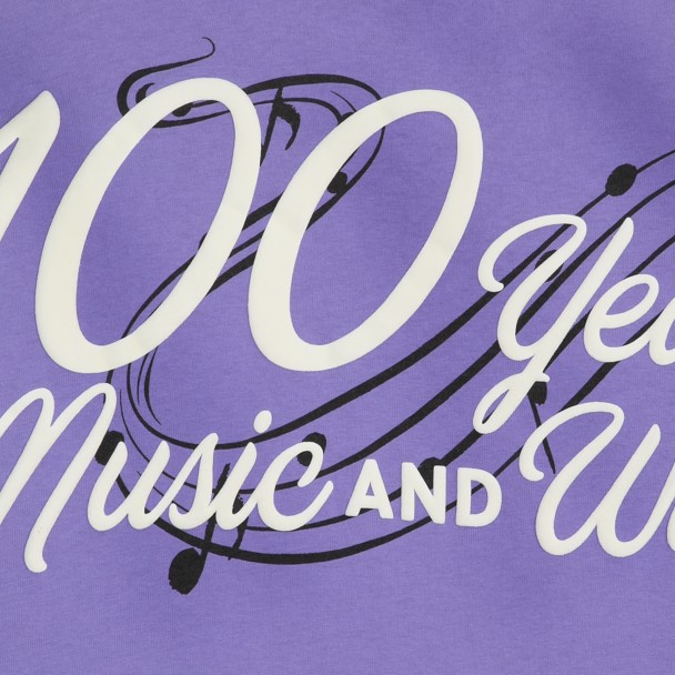 On the back, “100 Years of Music and Wonder” is screen printed in white along the shoulders, with black music notes swirling through the letters. Below that is more screen printed art of the characters included in this musical collection, surrounding Band Leader Mickey and a white castle silhouette.