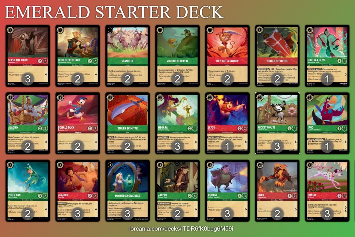 The full list of Disney Lorcana cards was revealed on the Lorcana app today, a week ahead of Gen Con. With all the cards revealed, TheGamer provided the lists of cards in each Lorcana starter deck. There are three starter decks: Ruby/Emerald, Sapphire/Steel, and Amber/Amethyst.