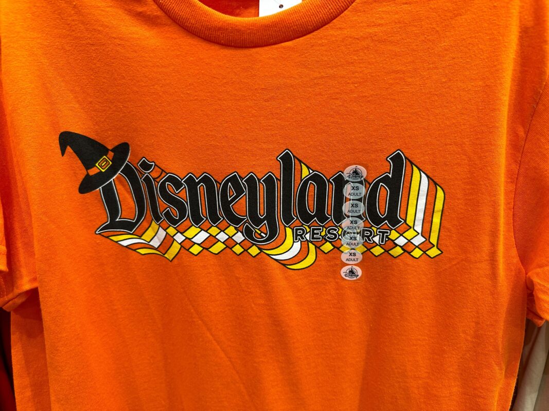 The tee is orange with “Disneyland Resort” in black lettering on the front. The lettering has a 3-D effect thanks to candy corn-colored shadows behind the words.