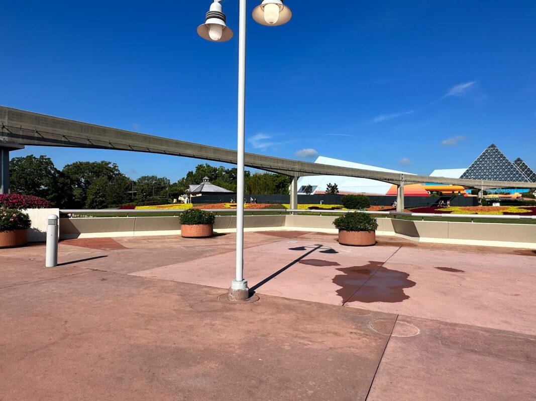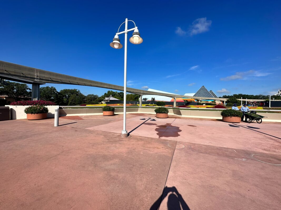 Here at the bridge leading from World Celebration to World Showcase, the topiaries of Mickey, Minnie, Chip, and Dale have all been removed.