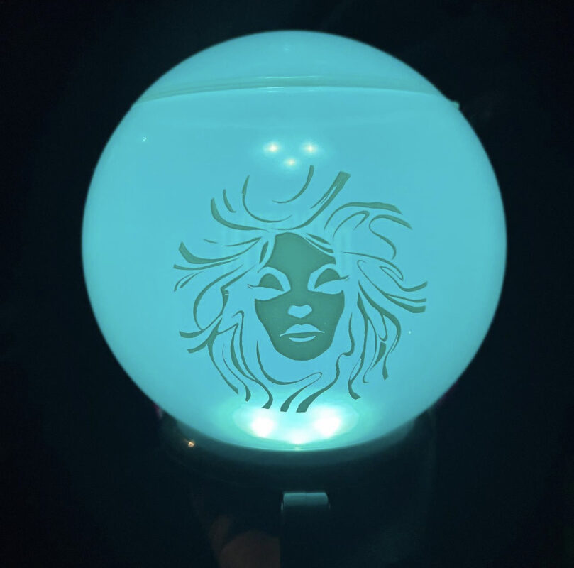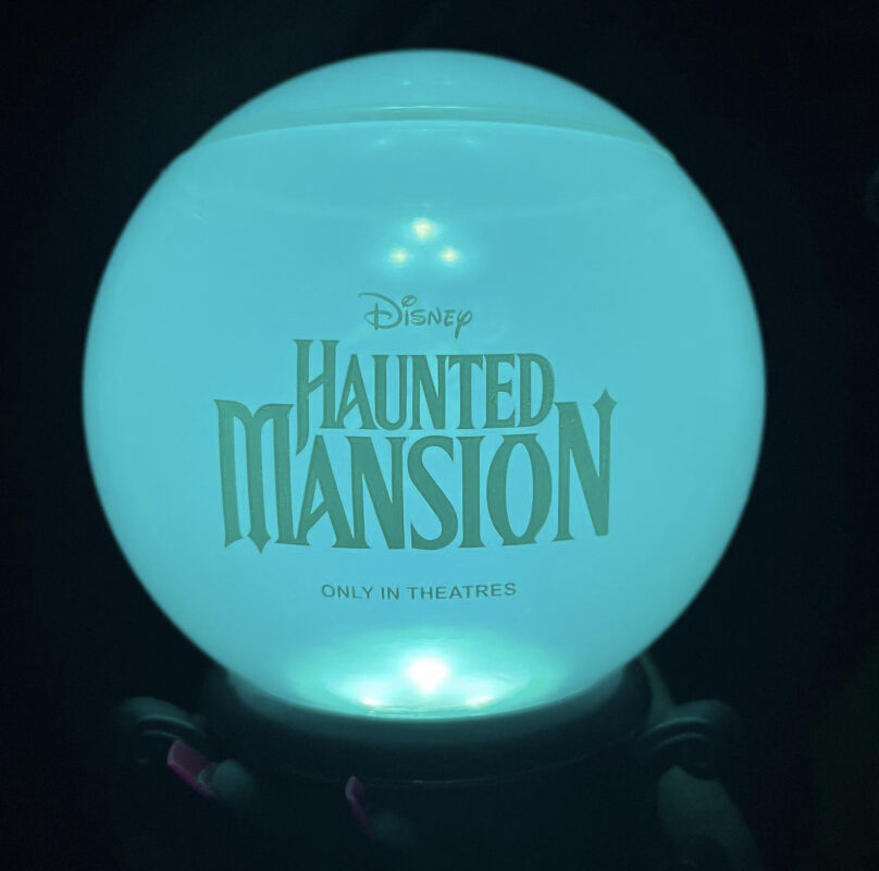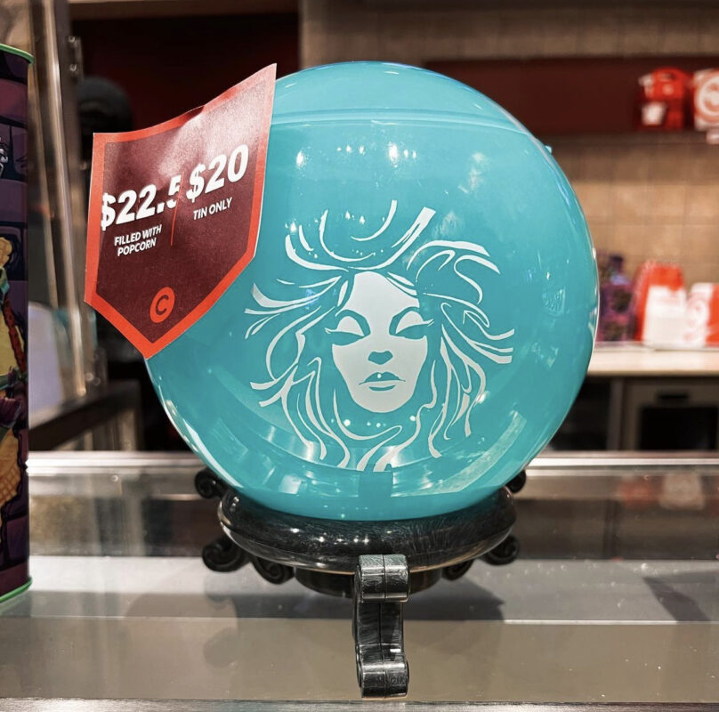 This new popcorn bucket features Madame Leota’s blue orb atop a black pedestal. Stylized art of her face is painted on the front of the bucket.