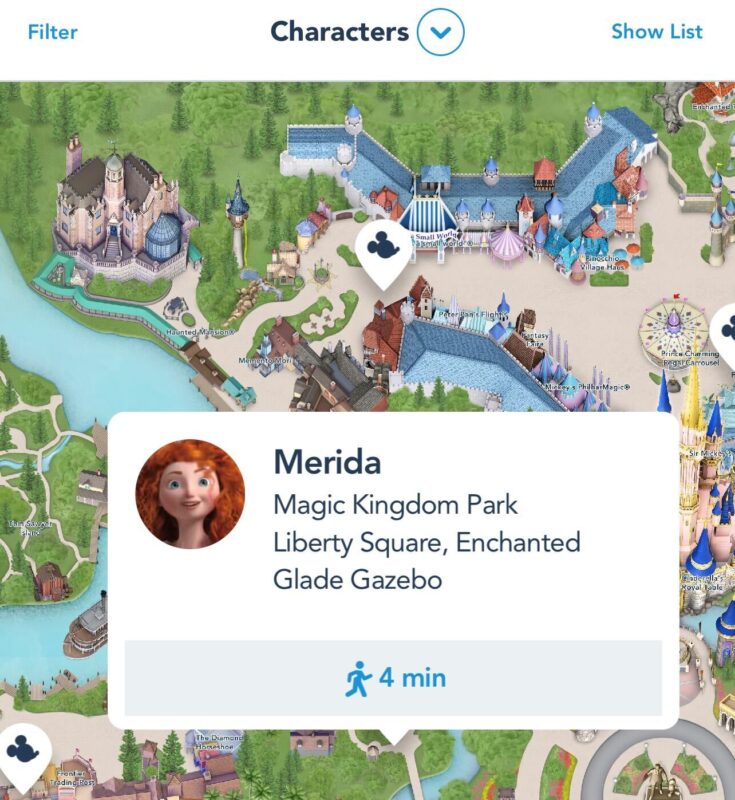 Merida’s new home is located at this Enchanted Glade Gazebo in Liberty Square, behind Ye Olde Christmas Shoppe. Here she is on the map of the My Disney Experience app: