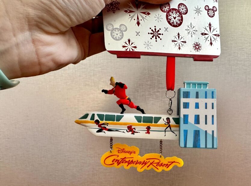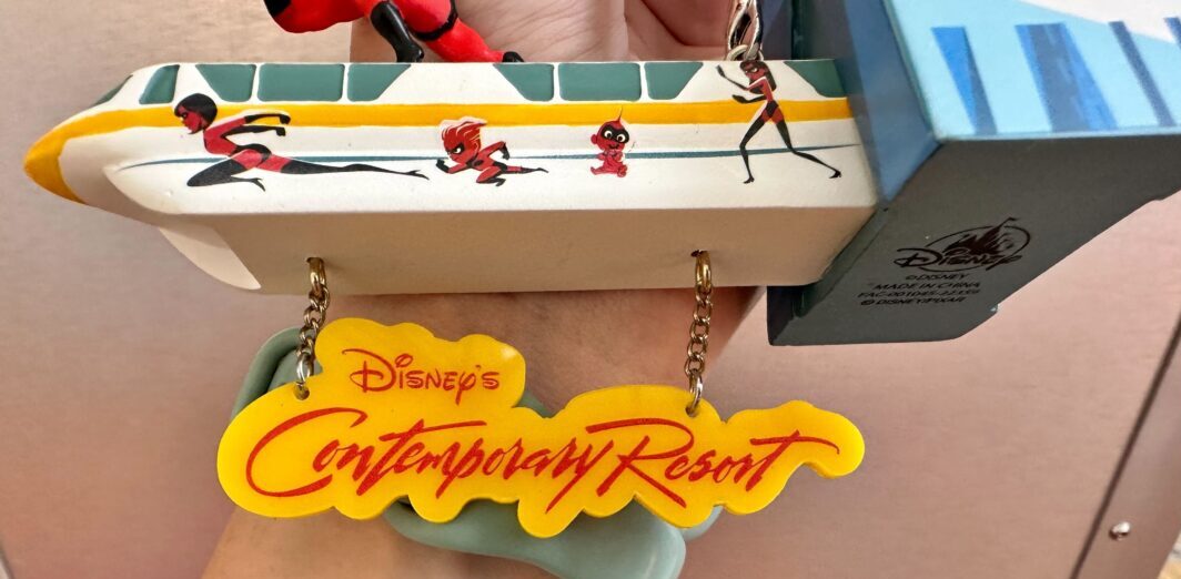 The rest of the Incredible family is shown on the side of the monorail. There is a dangle piece with the text “Disney’s Contemporary Resort” in the familiar typeface first introduced in 1987.