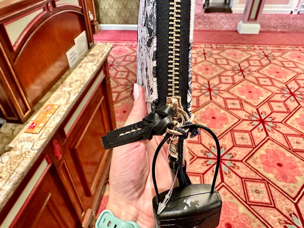 It has a detachable wristlet strap, attached to a ring near the zipper.