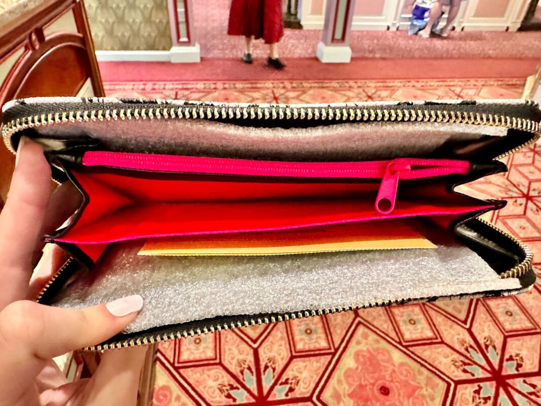 The main pocket also zips up and there’s a small open pocket inside. The lining is red.