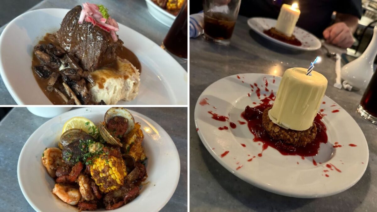 The seafood boil doesn’t have an official description but you’ll spot corn on the cob, andouille sausage, oysters, shrimp, and potatoes. It comes with rice on the side.
