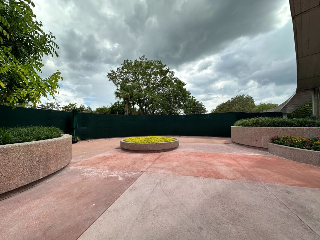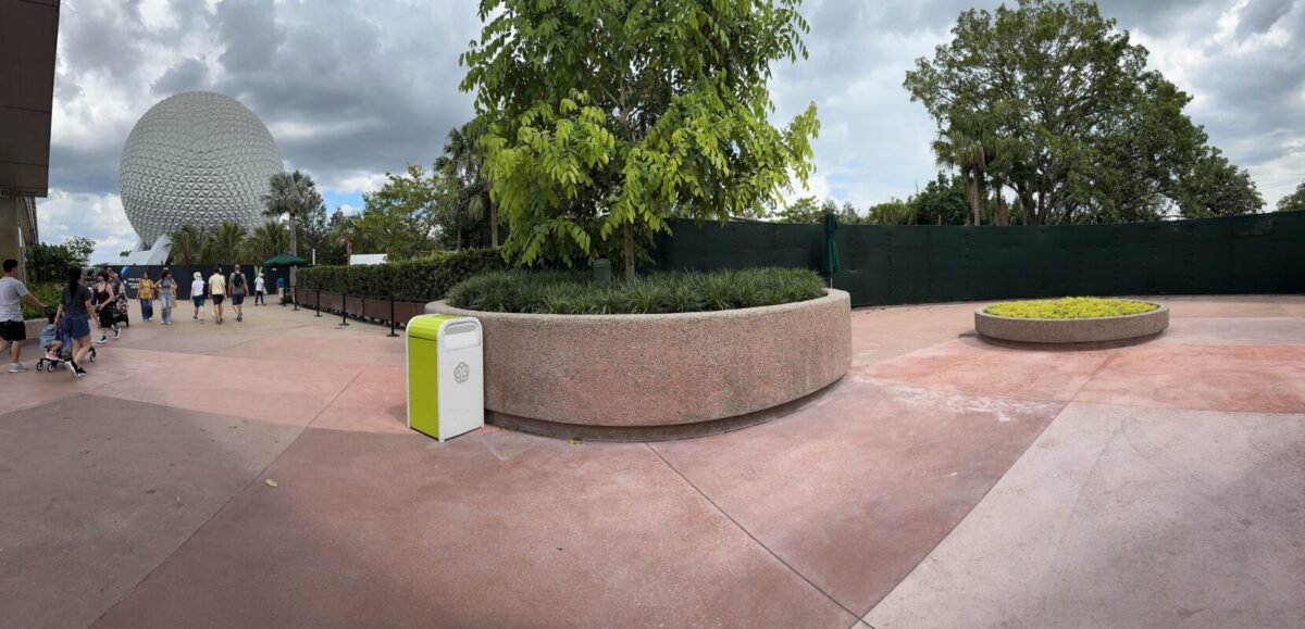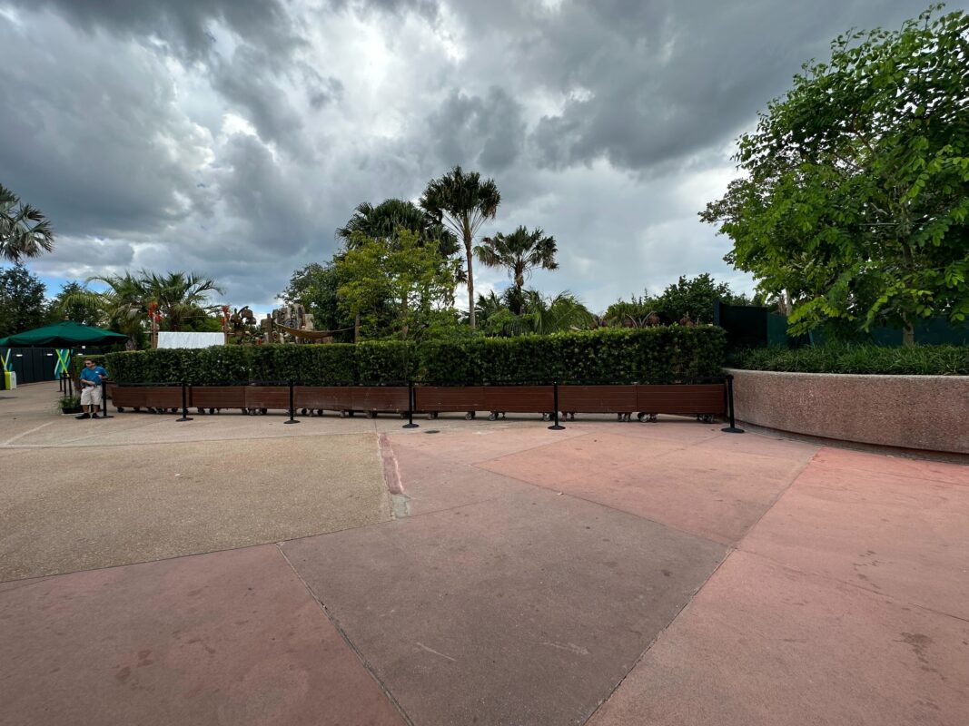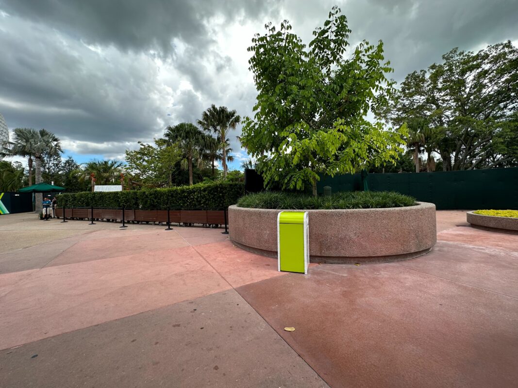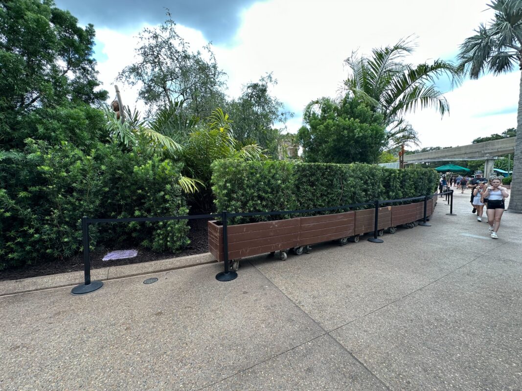 An umbrella and temporary stanchions have been added next to the rolling planters, presumably for the Cast Member previews when they begin on September 1.