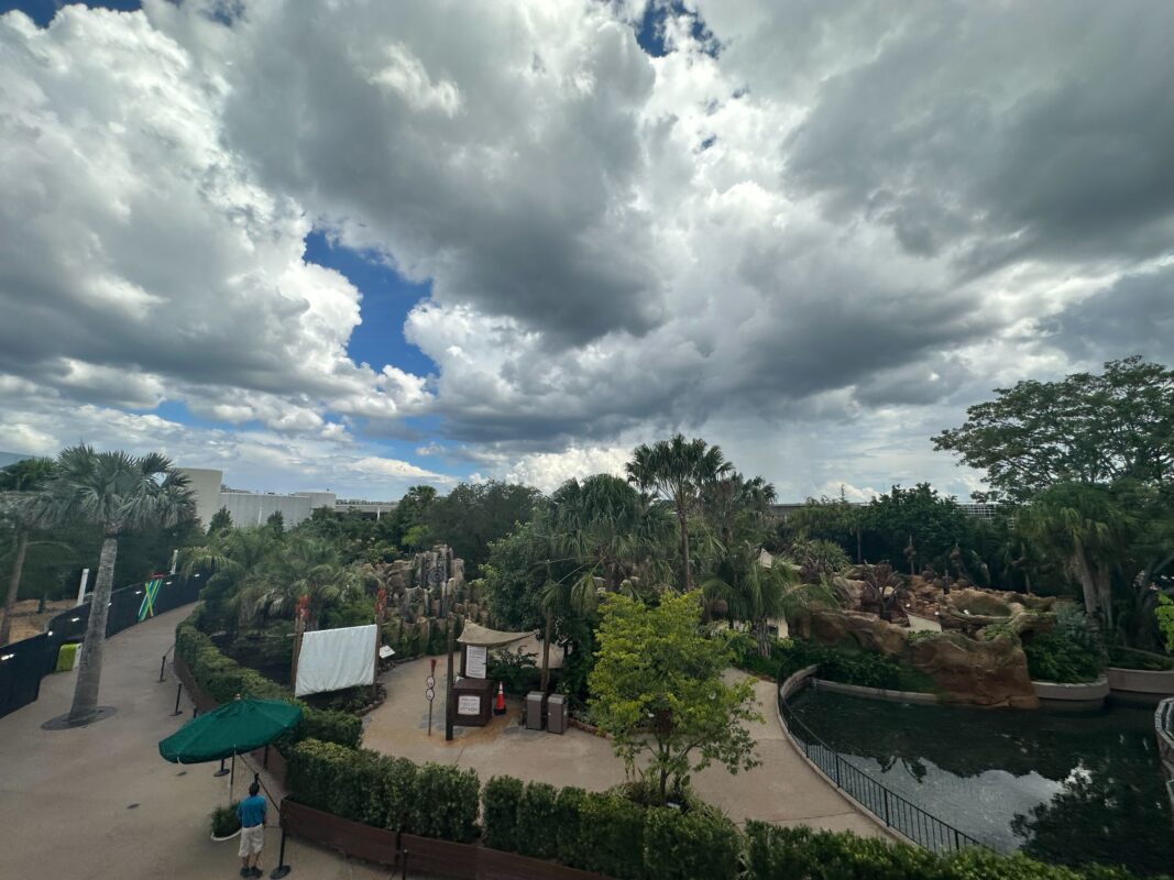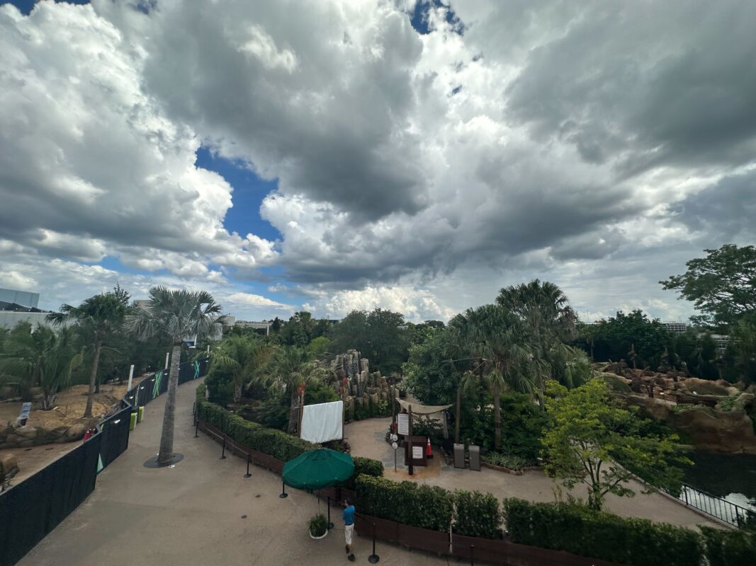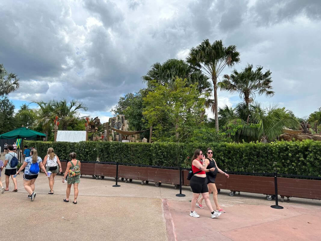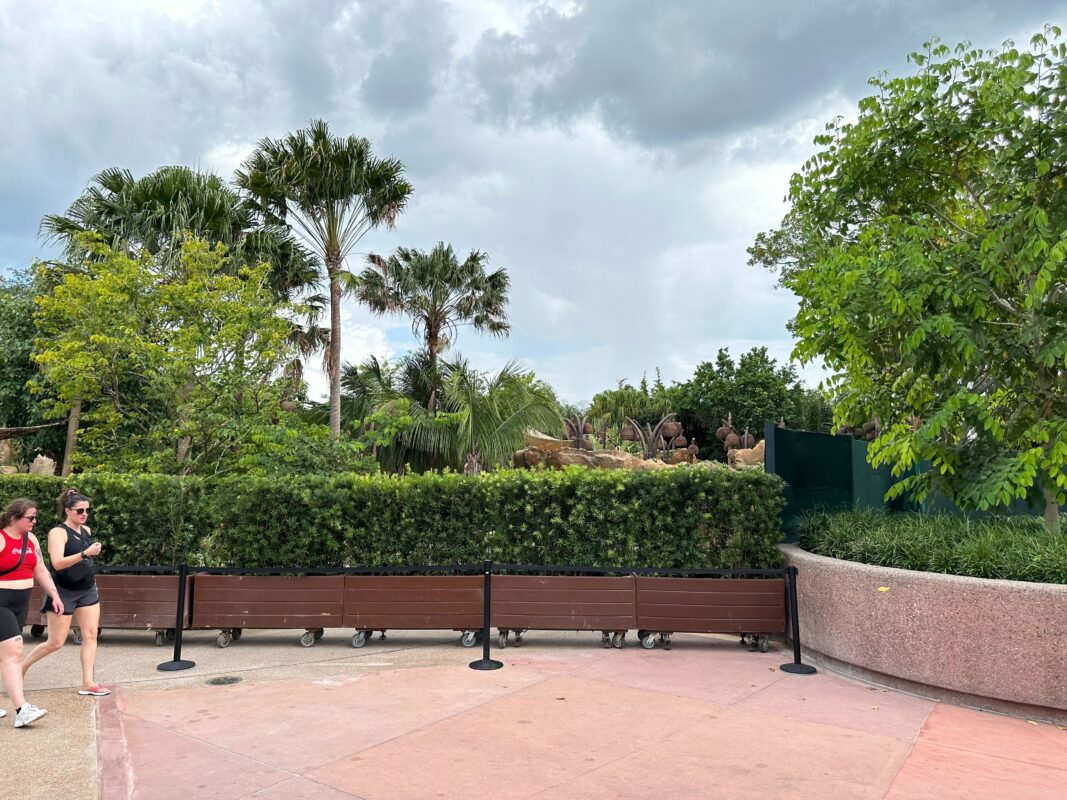 An umbrella and temporary stanchions have been added next to the rolling planters, presumably for the Cast Member previews when they begin on September 1.