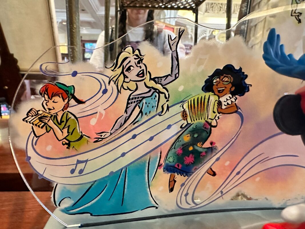 The characters included on the backdrop are Peter Pan and Tinker Bell from “Peter Pan,” Elsa from “Frozen,” Mirabel from “Encanto,” Figment, Joe Gardner from “Soul,” and Genie from “Aladdin.”