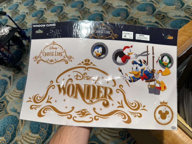 If you want to transform your windows into portholes, these window clings are for you. The Disney Wonder logo and surrounding ship bow is the largest decal. A similar illustration that reads “Disney Cruise Line” instead of “Disney Wonder” is also included. There’s also a sticker of a crowned porthole surrounding a silhouetted Mickey head. This set even will even allow you to apply the Donald and nephews’ art to any suitable surface.