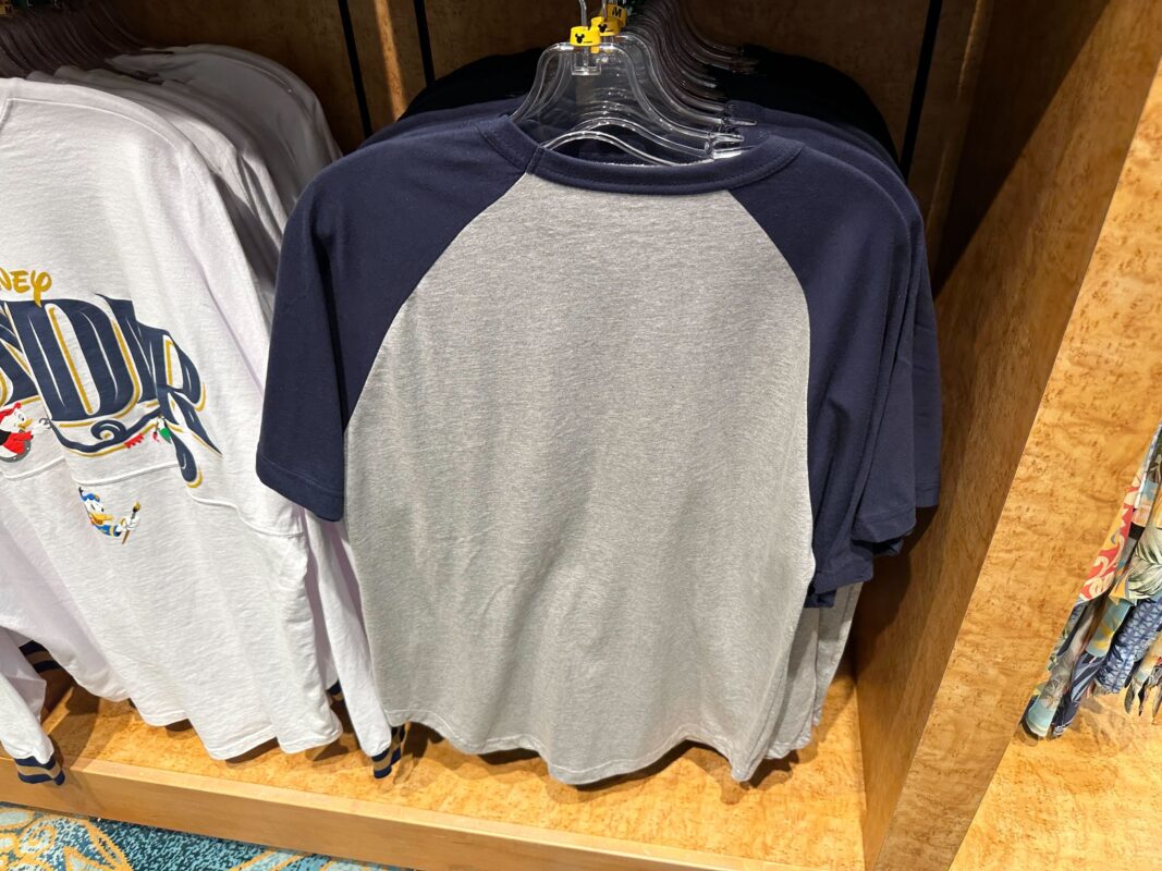 The back of the jersey contains a large print of the Disney Wonder logo, the navy font reading “Wonder” surrounded by a gold outline. A modified version of the Donald art appears underneath the logo, with Donald hanging from the N in “Wonder” (not for long, though, if Huey has his way).