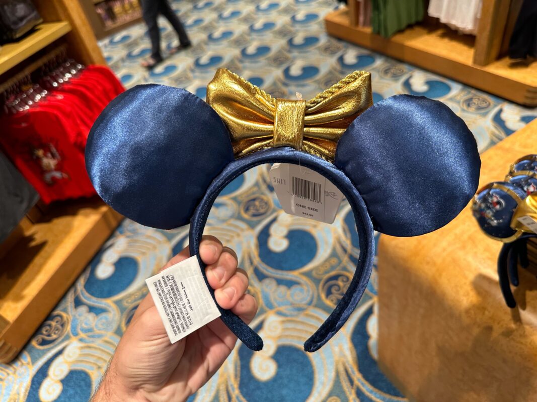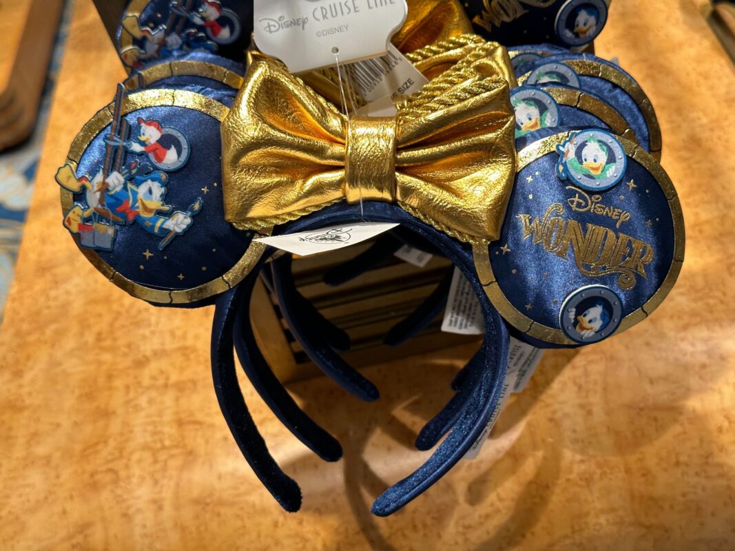 These ears, attached to a flexible padded headband, are covered with a dark navy fabric bordered by gold trim. Its centerpiece is a bow that matches the trim in color. The trim surrounding the ears is intermittently broken by navy lines, giving each ear the appearance of a porthole. Gold stars of varying sizes fill each ear, and the Disney Wonder logo is present on the left side.