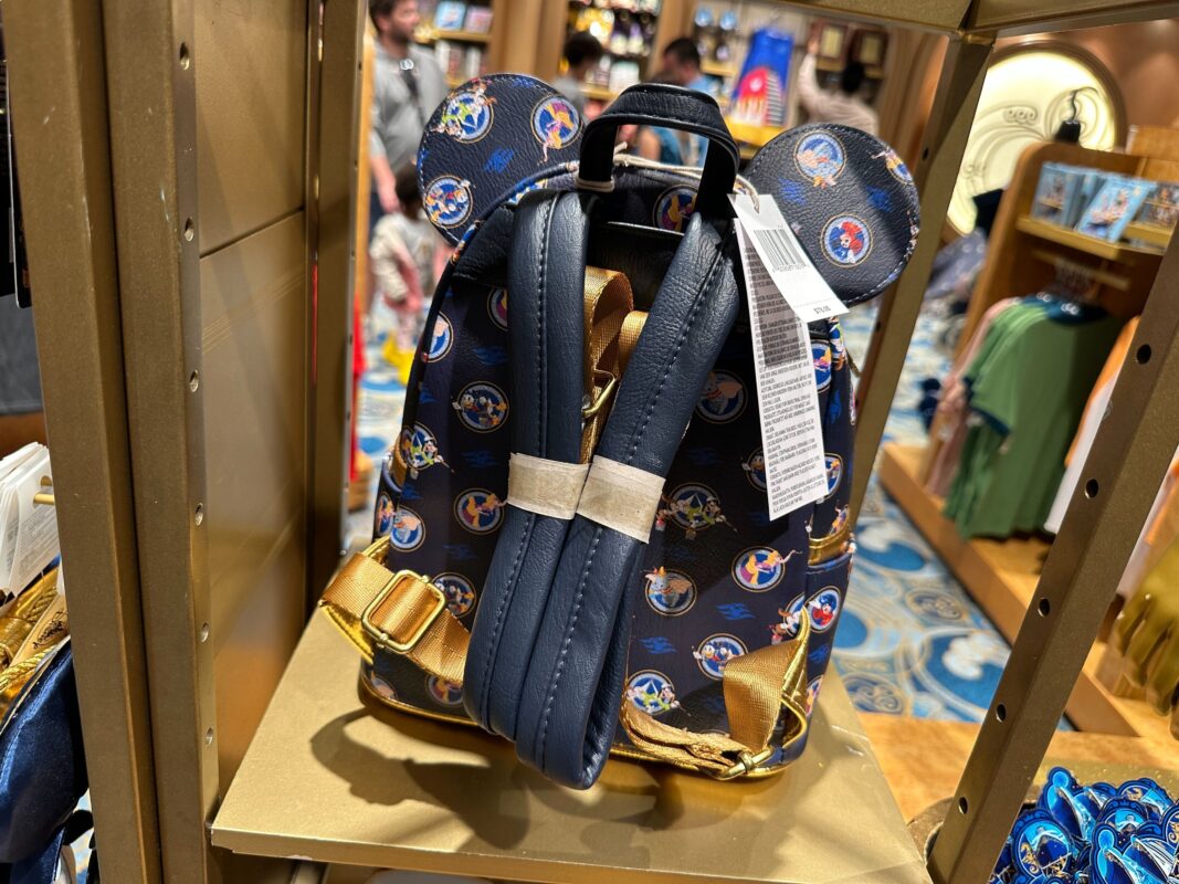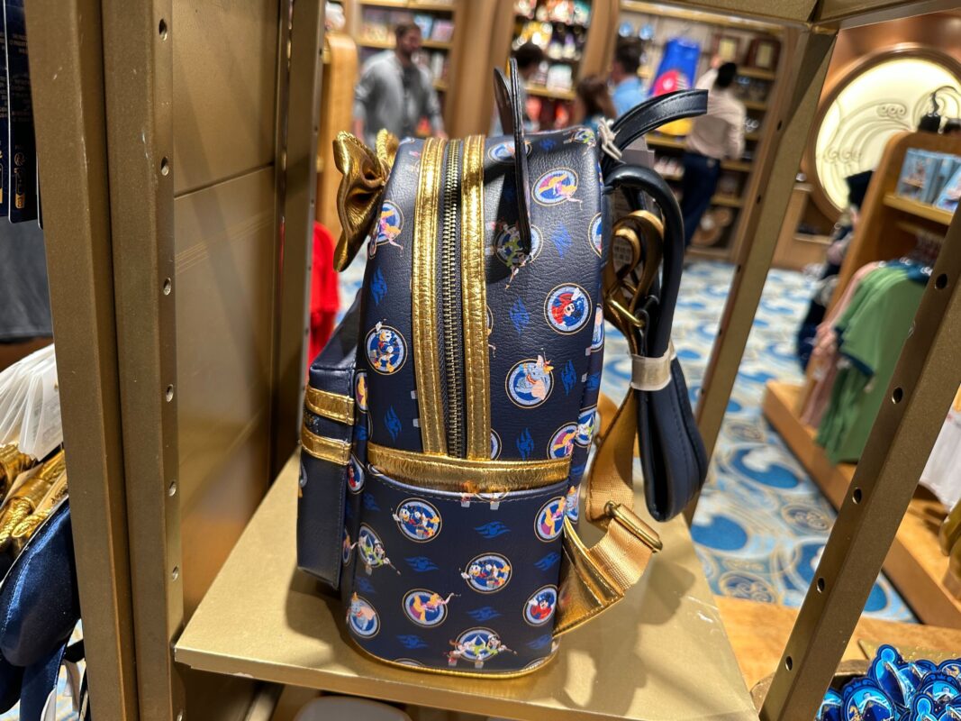 This Loungefly backpack shares a lot of aesthetics with the Minnie ears, using the same bow on its front. It matches the ears in hue, the navy color broken up by royal blue prints of the Disney Cruise Line logo, and art of Disney characters appearing in front of or behind portholes. We spotted Goofy, Dumbo, and Mickey in his “Sorcerer’s Apprentice” garb, just to name a few.