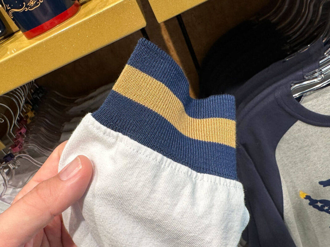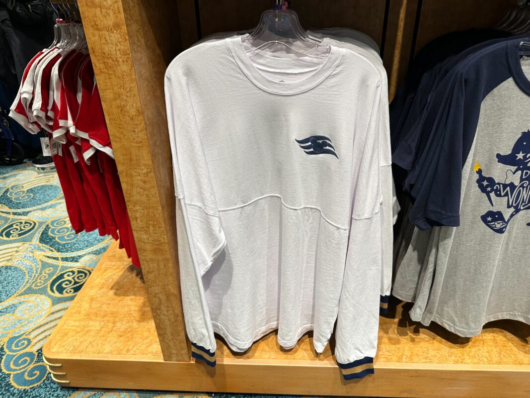 This white long-sleeved jersey has a navy version of the Disney Cruise Line logo embroidered atop the left breast. The sleeves are cuffed with navy and gold stripes, composed of a stretchy fabric.