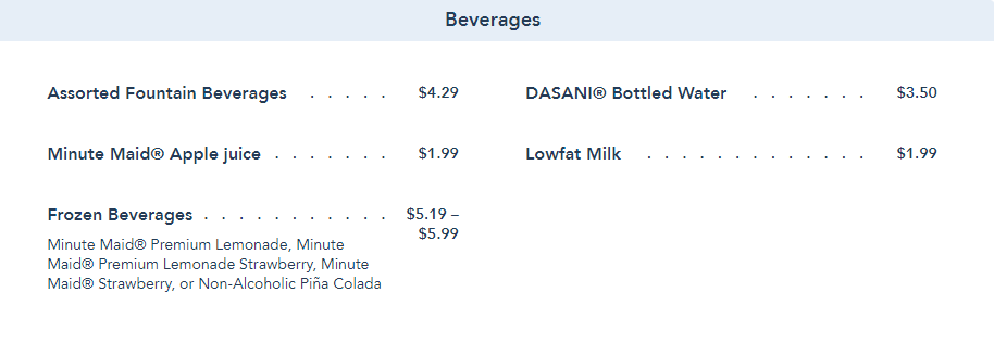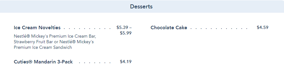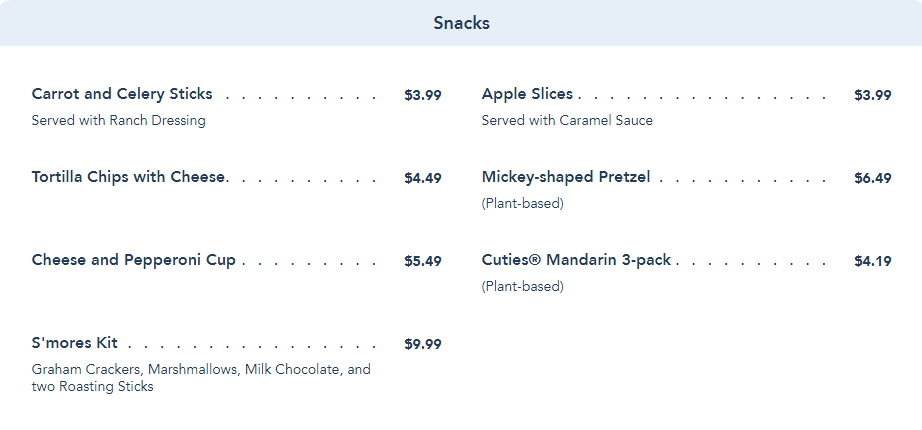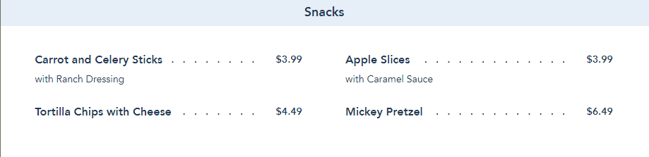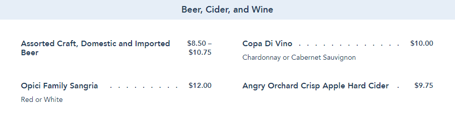 Previously, the Meadow Snack Bar consisted of specialty entrées, salads & pizza, snacks, desserts, kids’ Disney Check meals, kids’ meals, non-alcoholic beverages, beer, cider, wine, and specialty drinks with alcohol.