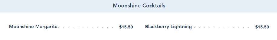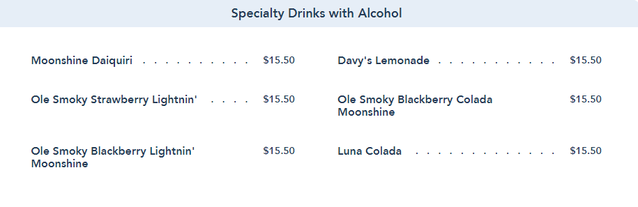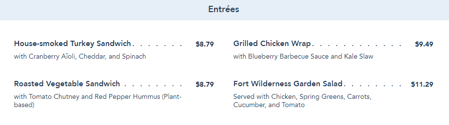 The Entrées section has completely changed, and Salads and Pizza has been entirely removed, with the Fort Wilderness Garden Salad being relocated to the Entrées section. The Specialty Drinks with Alcohol section has also been entirely paired down, going from six different options to two moonshine-based cocktails only.
