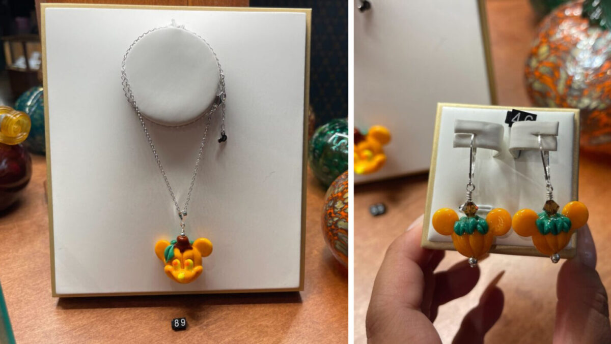 A new glass Mickey jack-o’-lantern necklace and matching glass Mickey pumpkin earrings are both available now at Magic Kingdom.