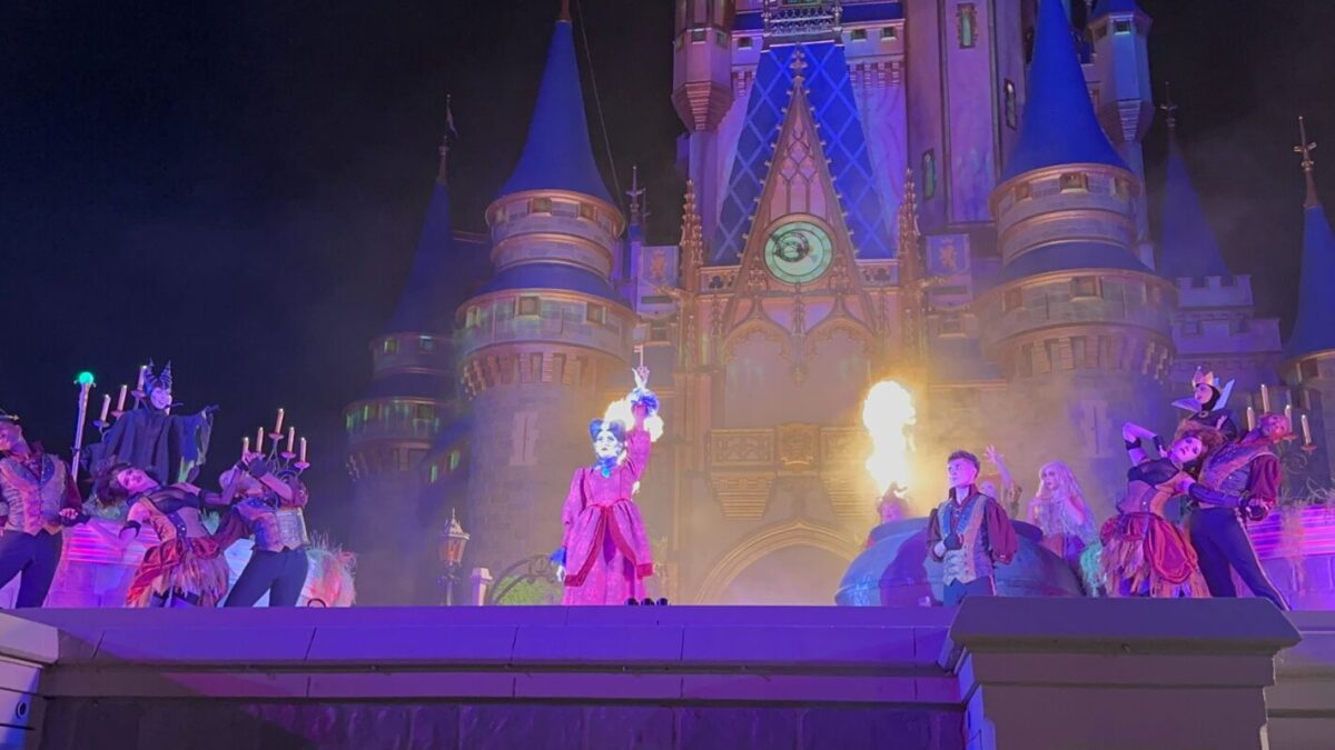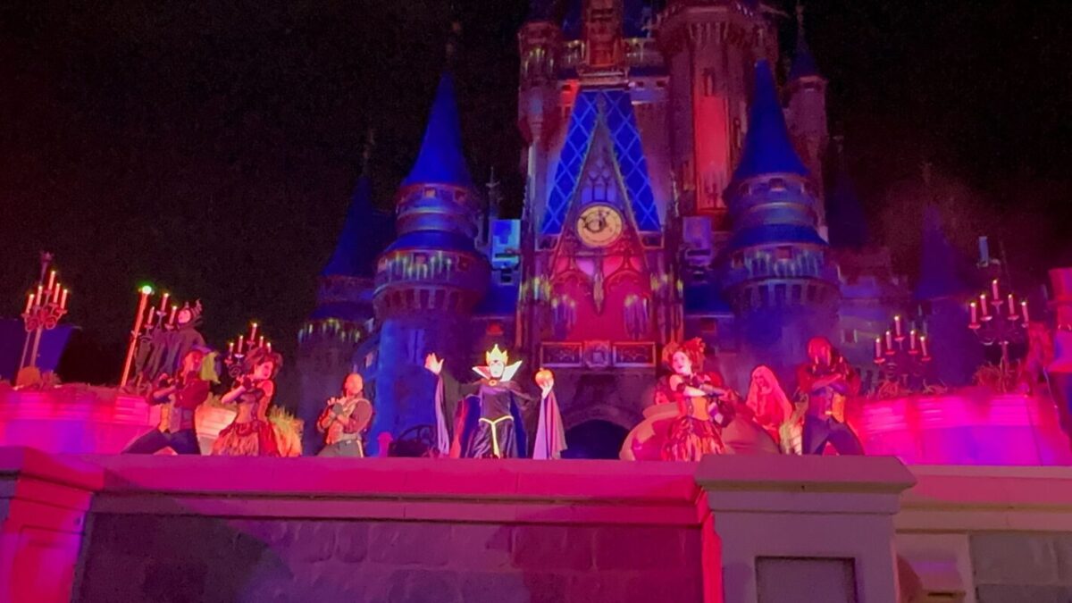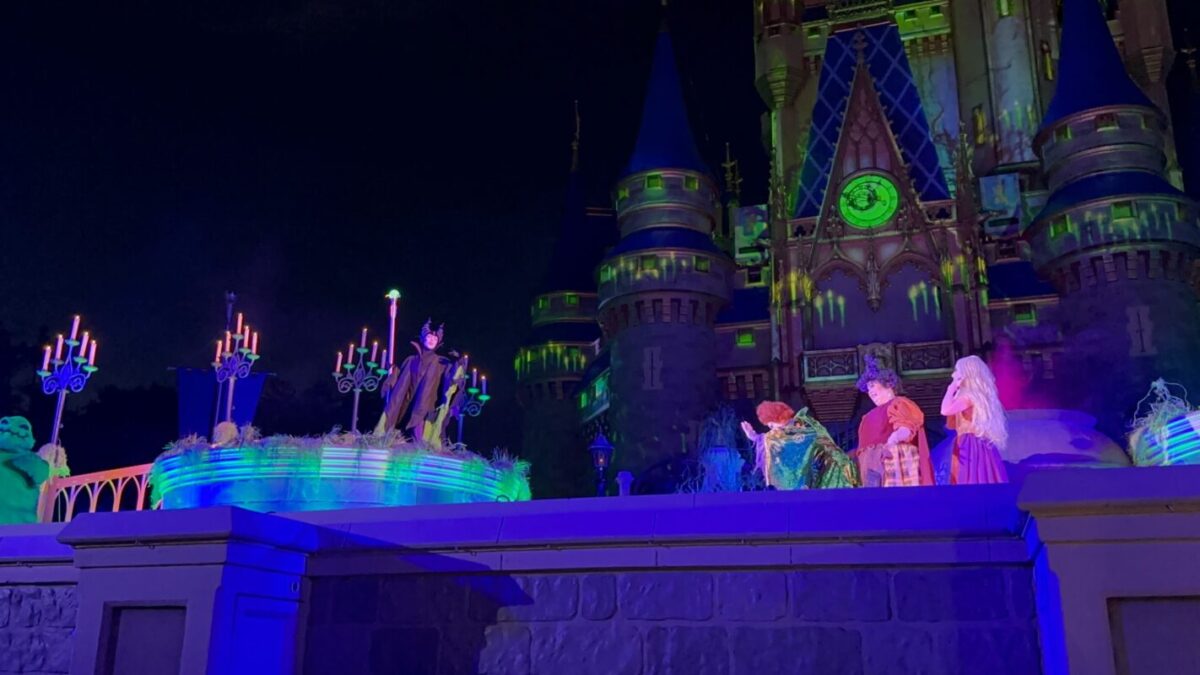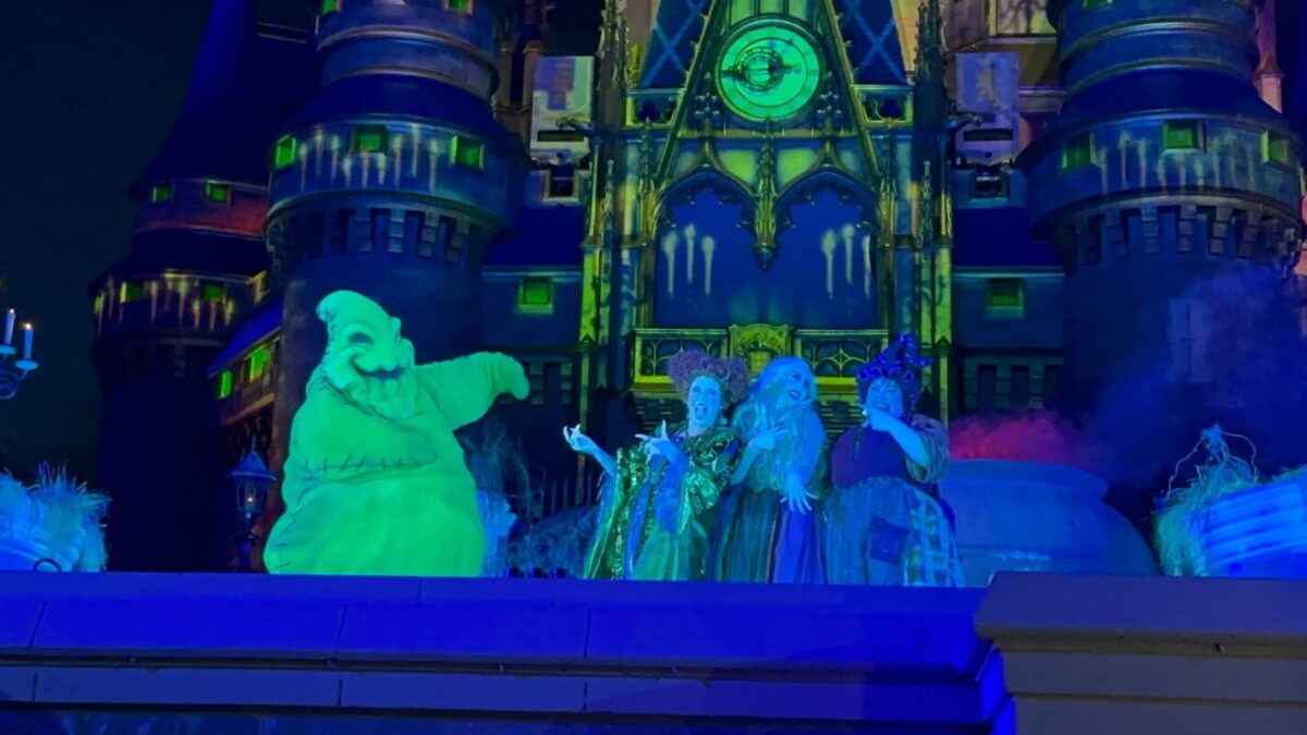 Guests at Mickey’s Not-So-Scary Halloween Party can check out the Hocus Pocus Villain Spelltacular stage show at Cinderella Castle.