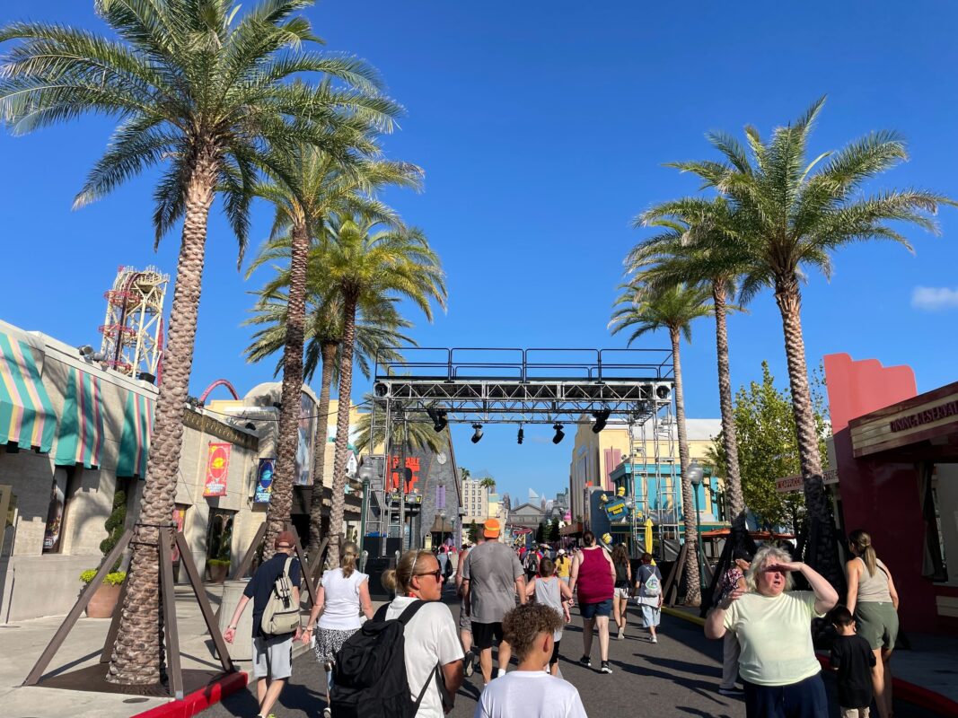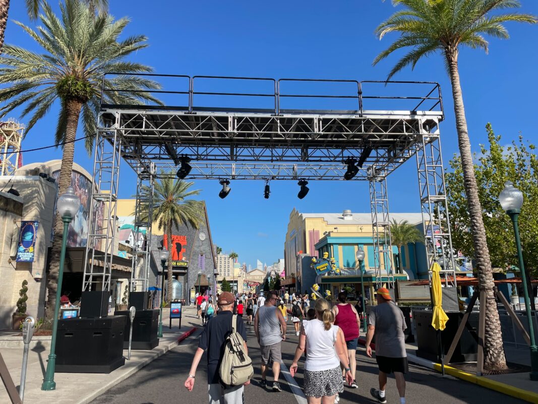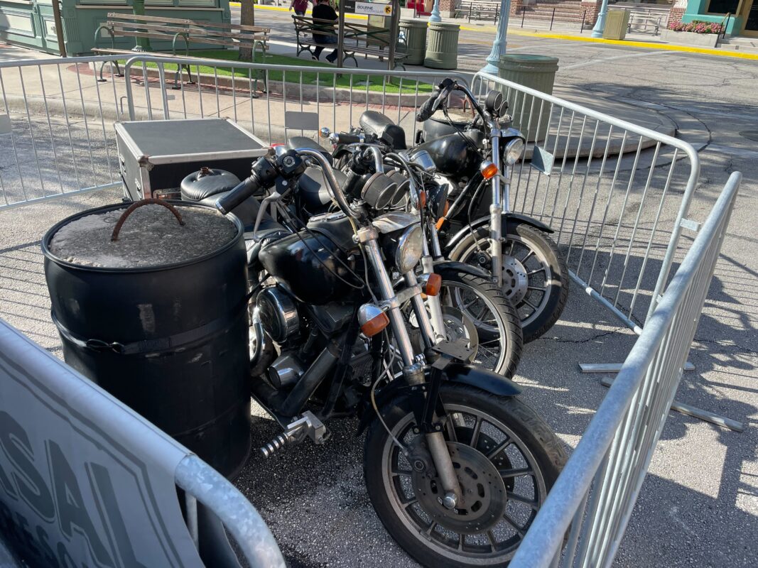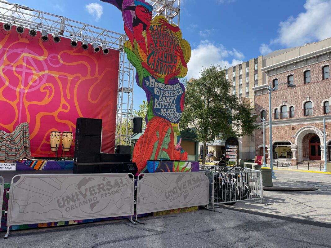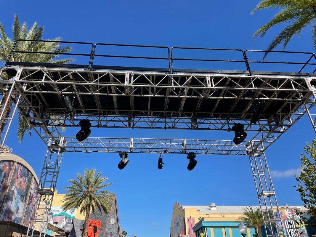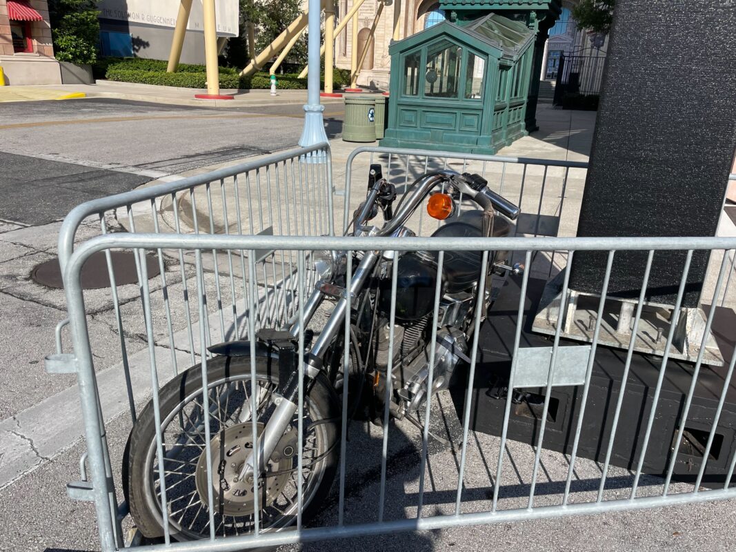 Construction continues on Halloween Horror Nights 32 scare zones and other themed experiences at Universal Studios Florida. Earlier this week, we chronicled a crashed plane in the Jungle of Doom scare zone. Now, there is a bus and motorcycles parked in the music fest-themed Vamp ’69 scare zone, bats in the Jungle of Doom, and extra stage lights throughout the park.