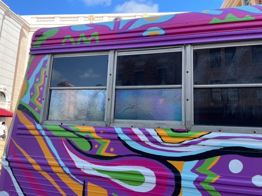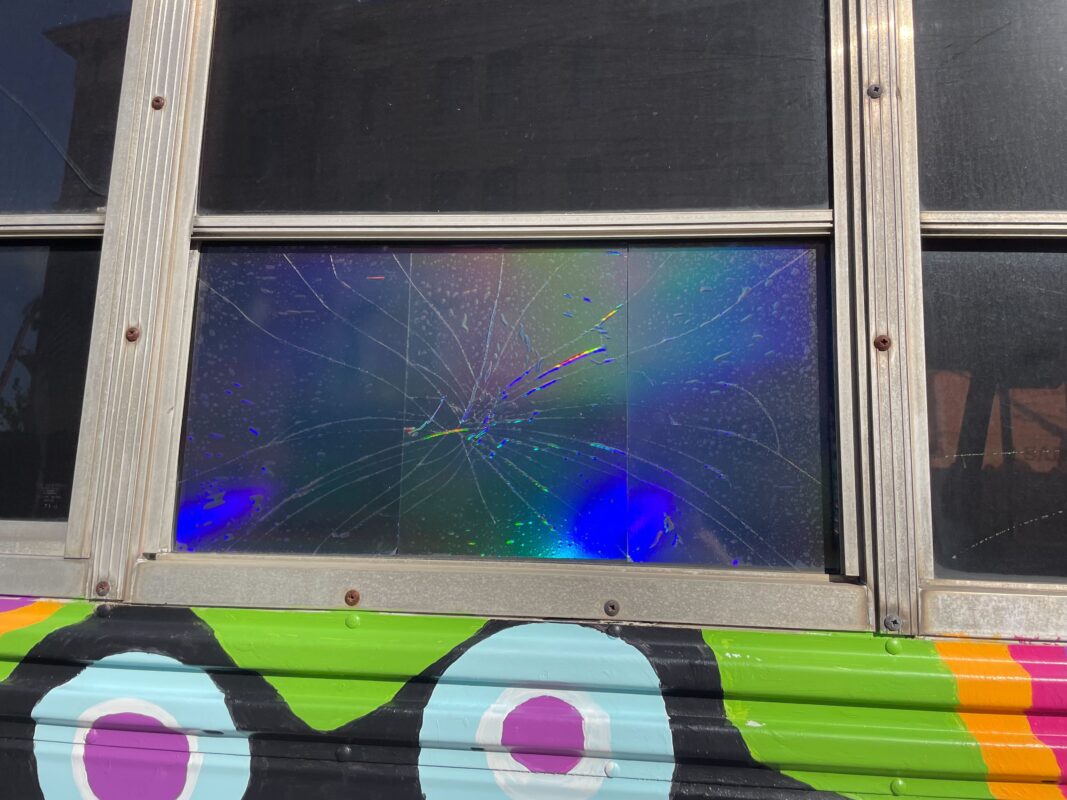 Not all is as “peace and love” as it appears though — a couple of windows near the back of the bus are shattered.
