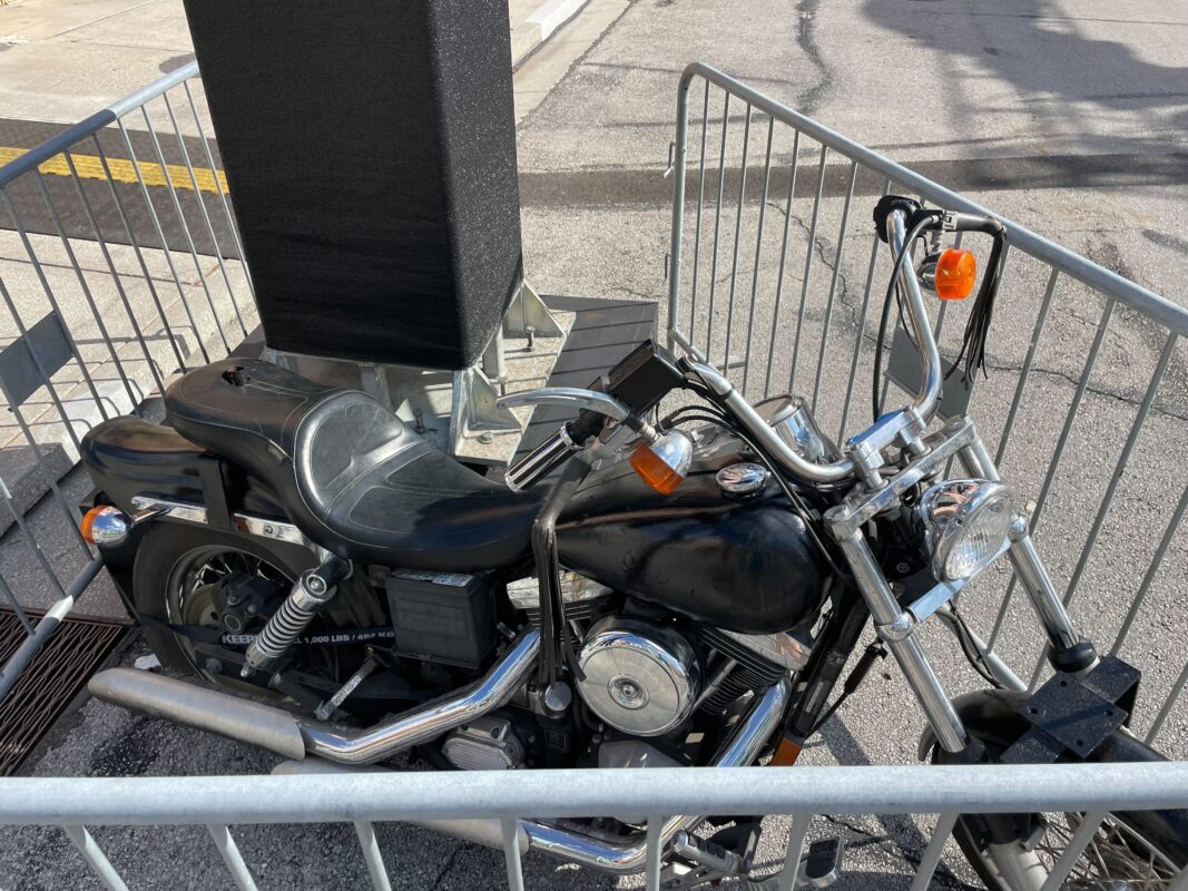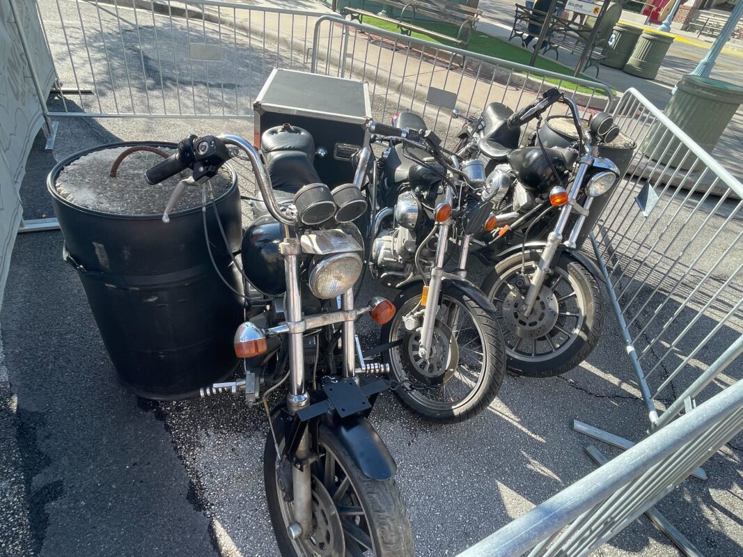 Next to the Tribute Store, a motorcycle is parked next to one of the trusses.