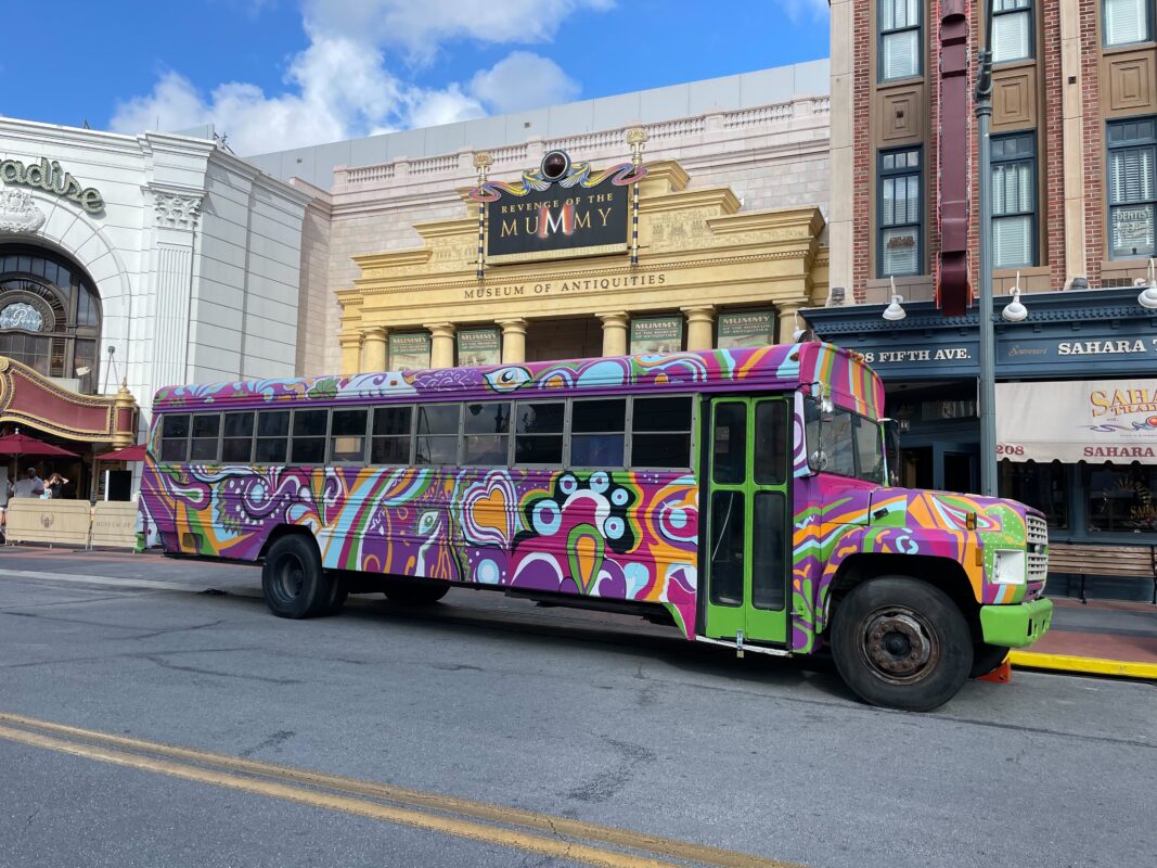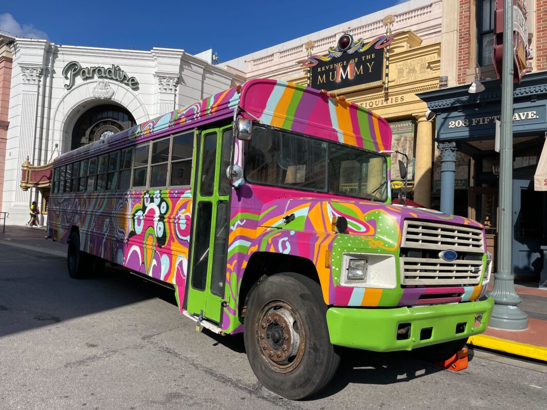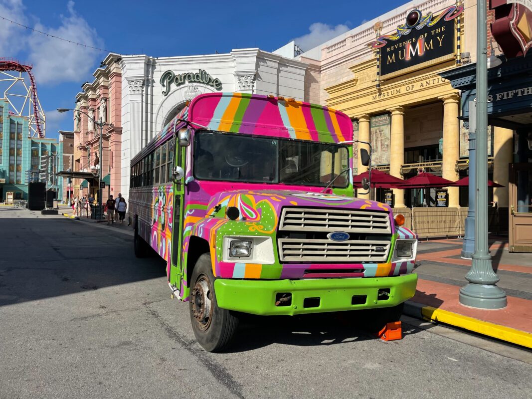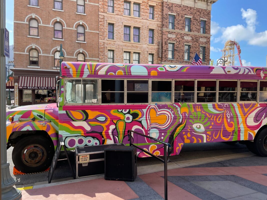 The bus looks straight out of the late 1960s, perfect for the hippie music festival scare zone.