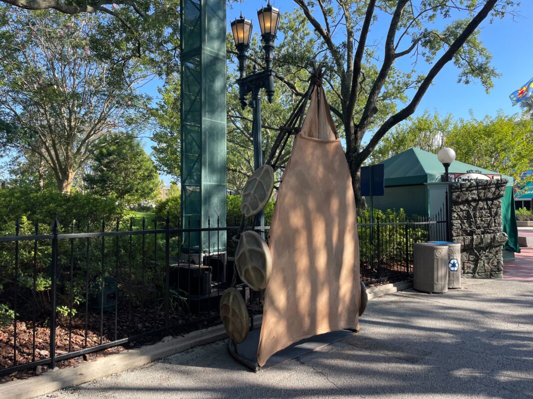 Giant leaf sculptures are on the sides, attached to bent poles, with a brown tarp on the front.