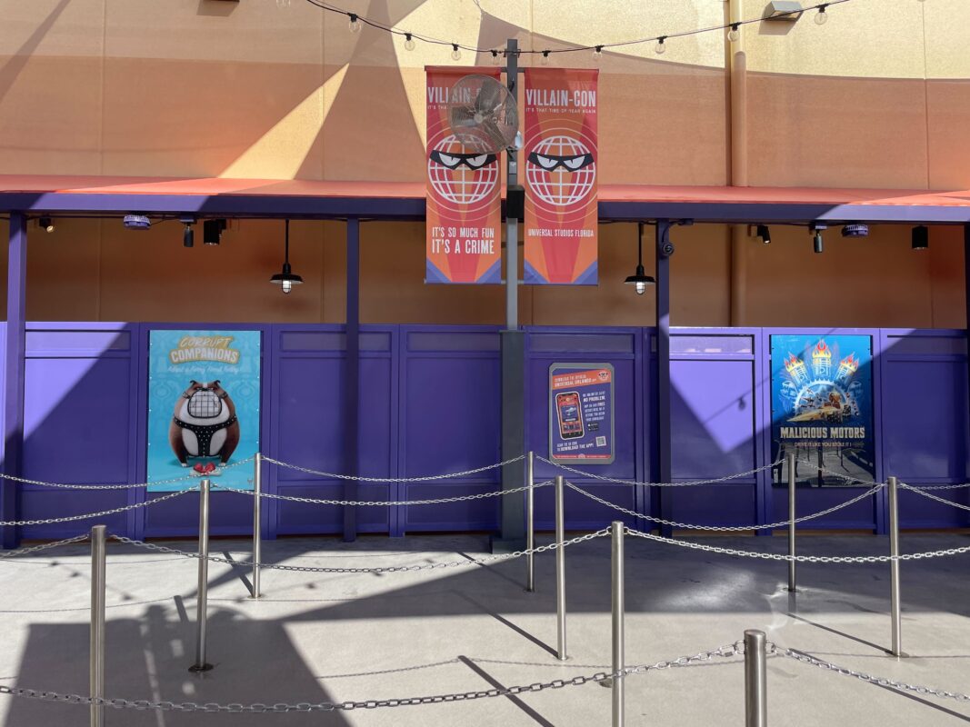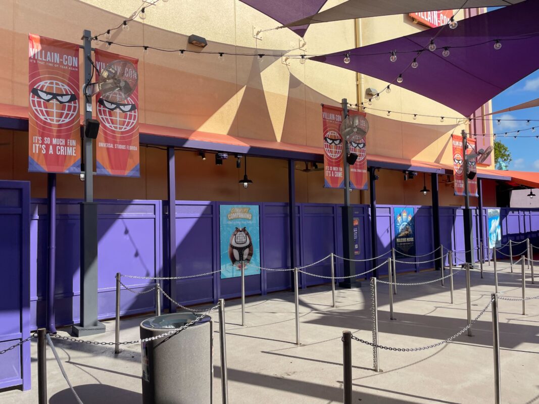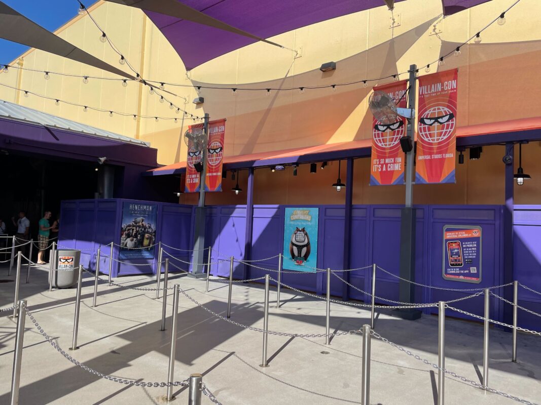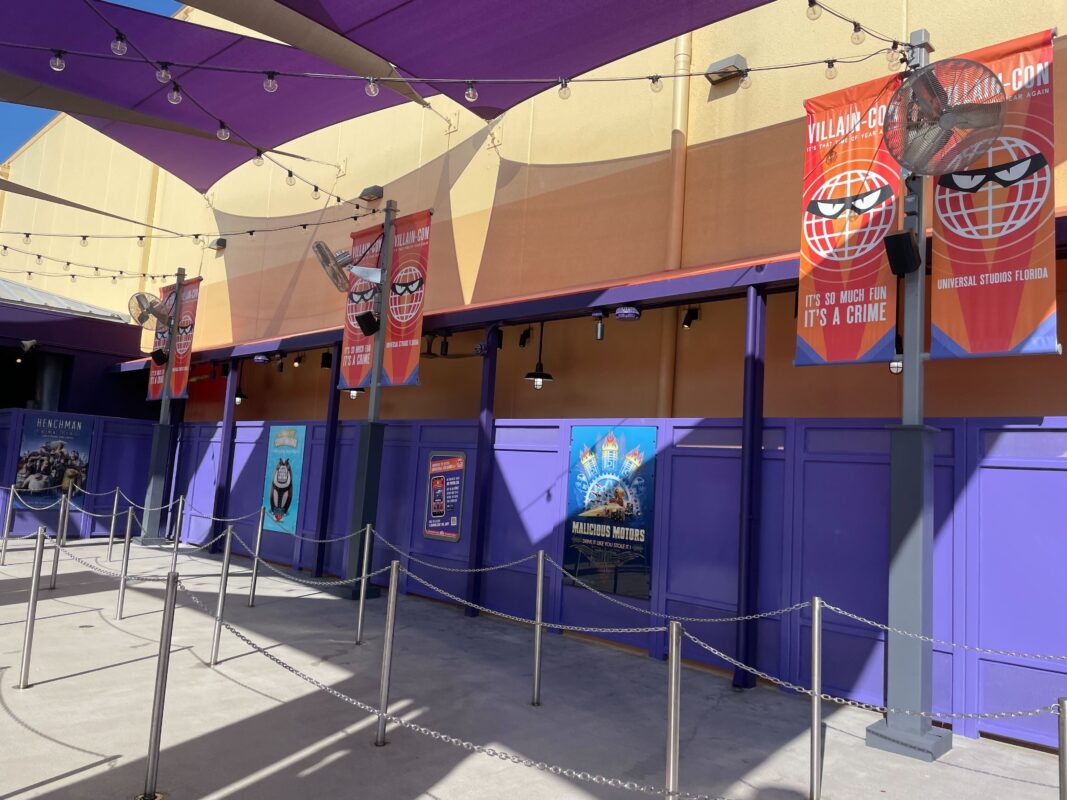 The exterior queue has been repainted and features Villain-Con banners, but otherwise isn’t super themed.