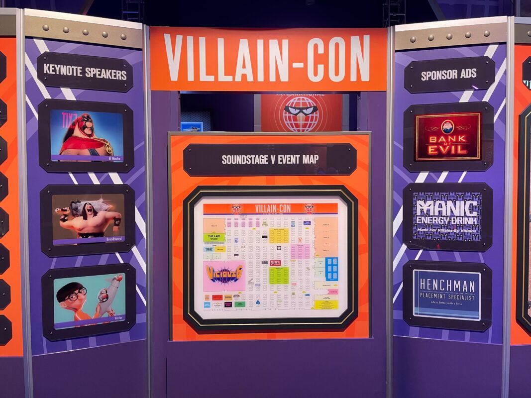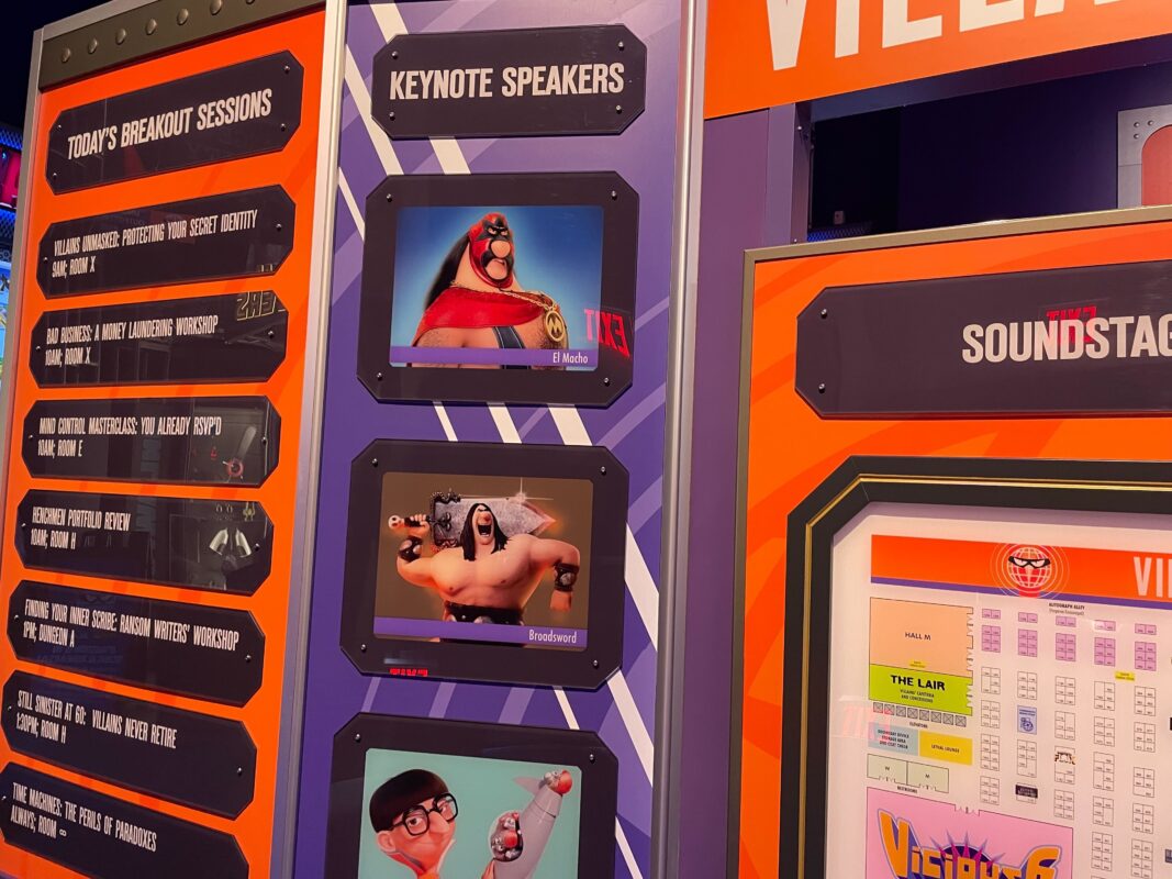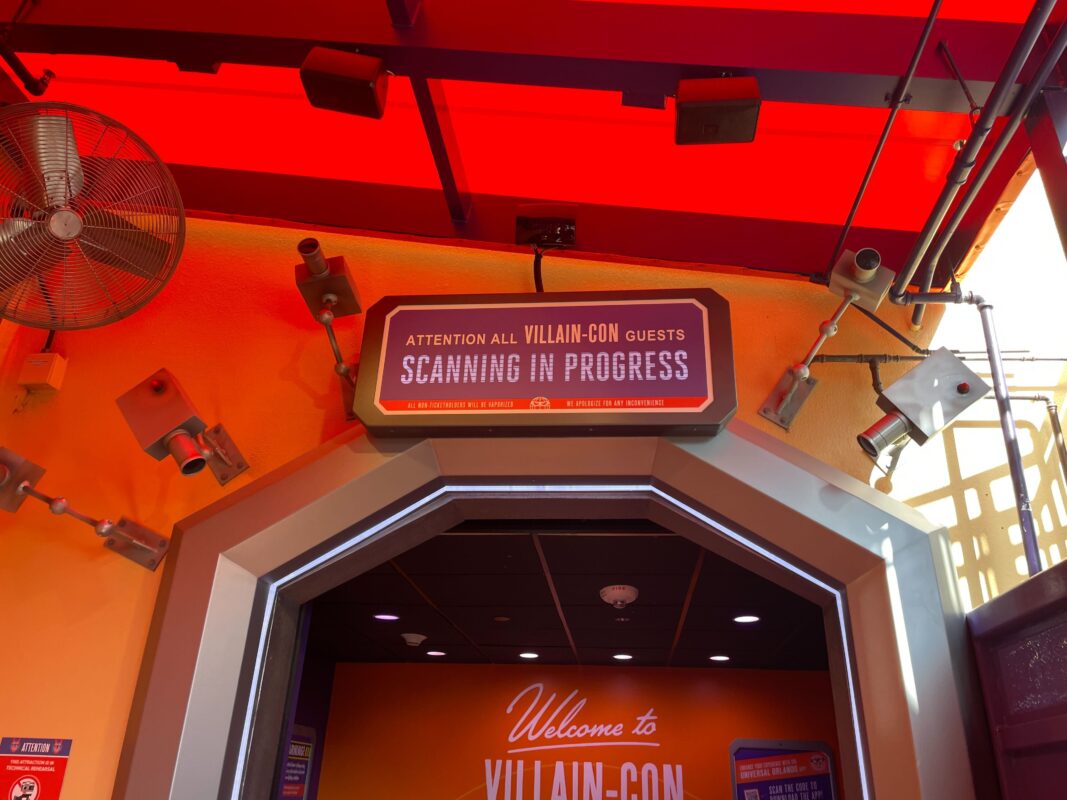 Several fake security cameras are around the doorway leading inside and a sign reads “Attention all Villain-Con guests. Scanning in progress.”