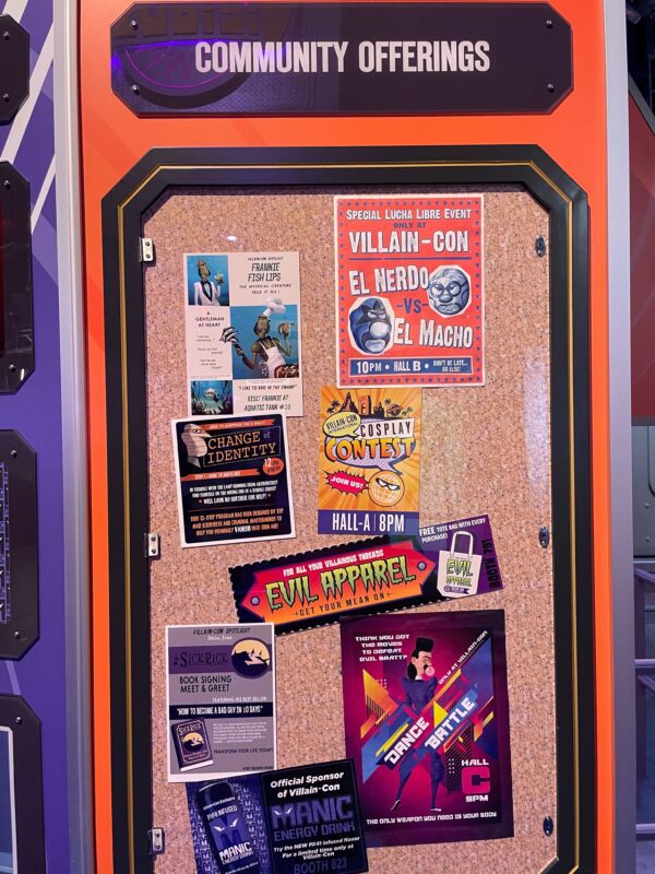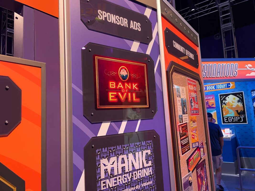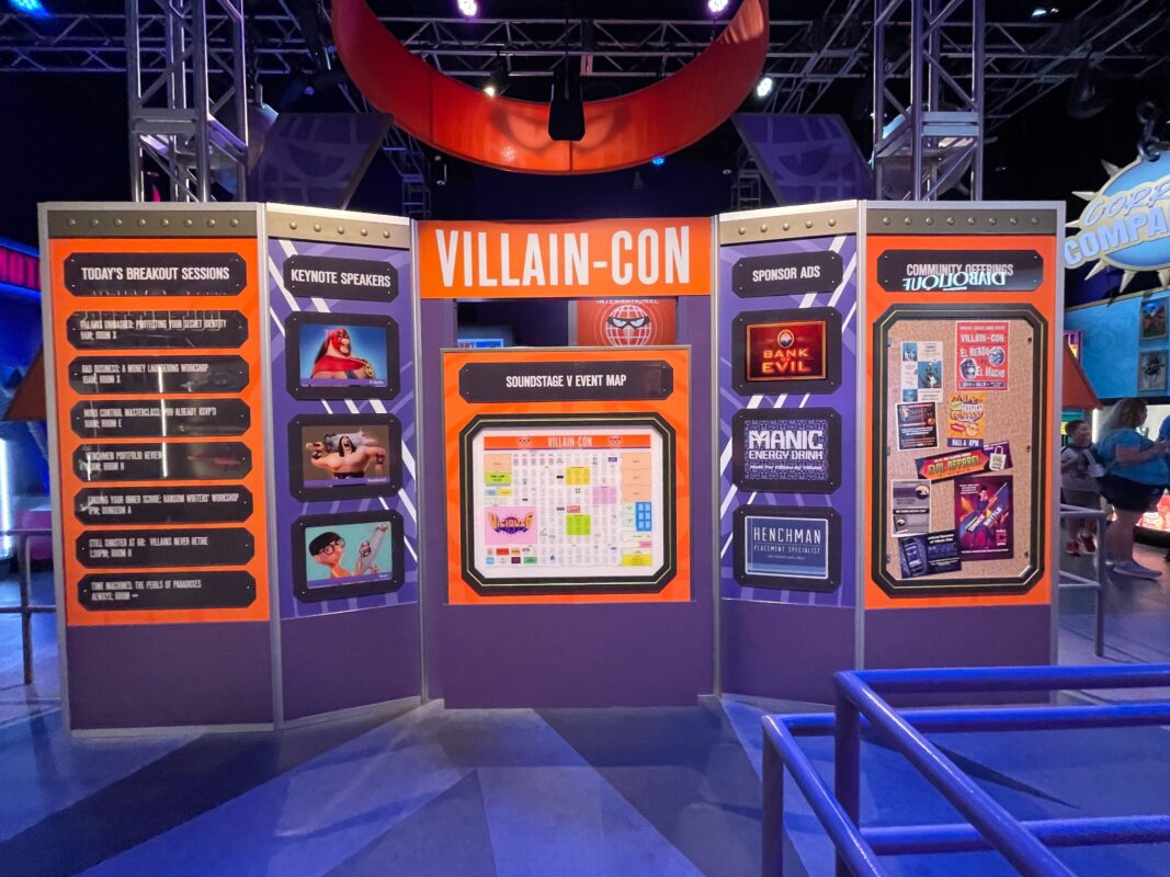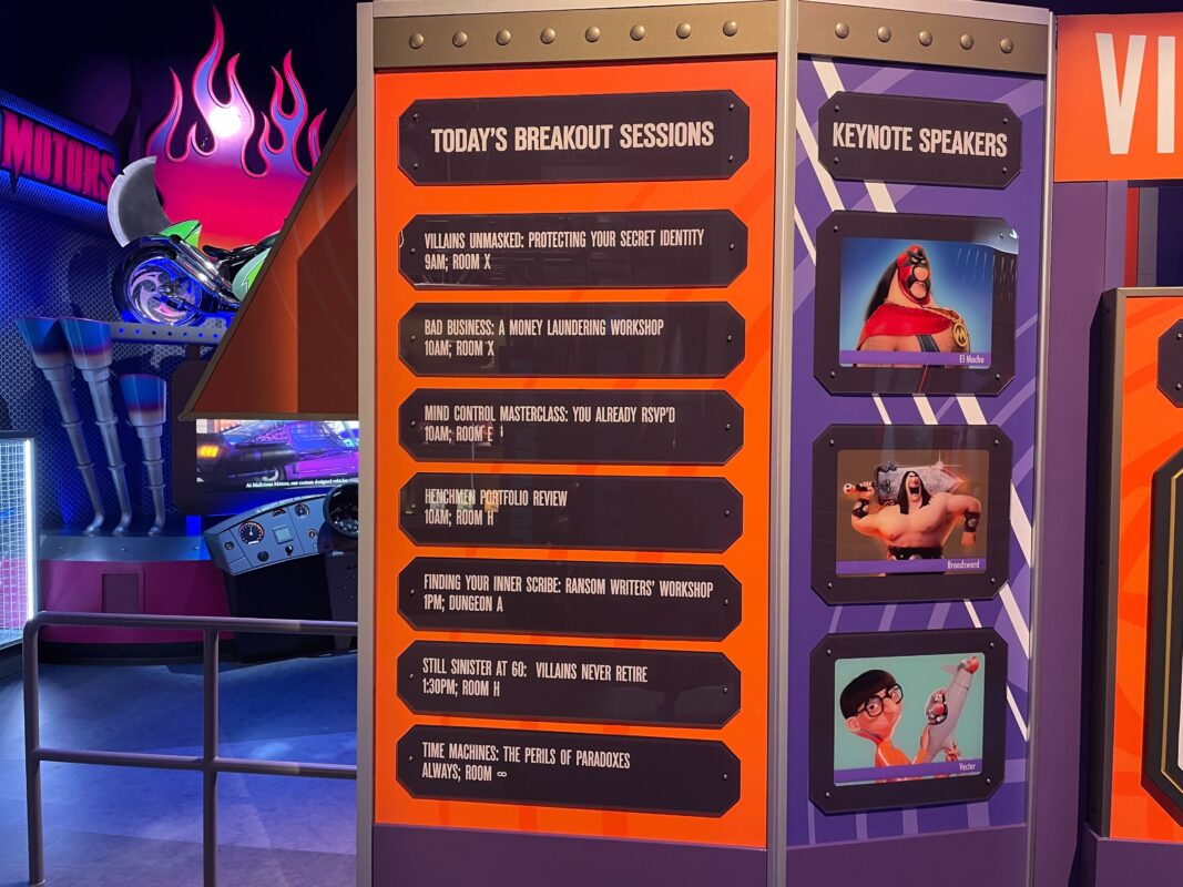 As guests go down a thin hallway, they pass under screens providing exposition for Villain-Con and the ride.