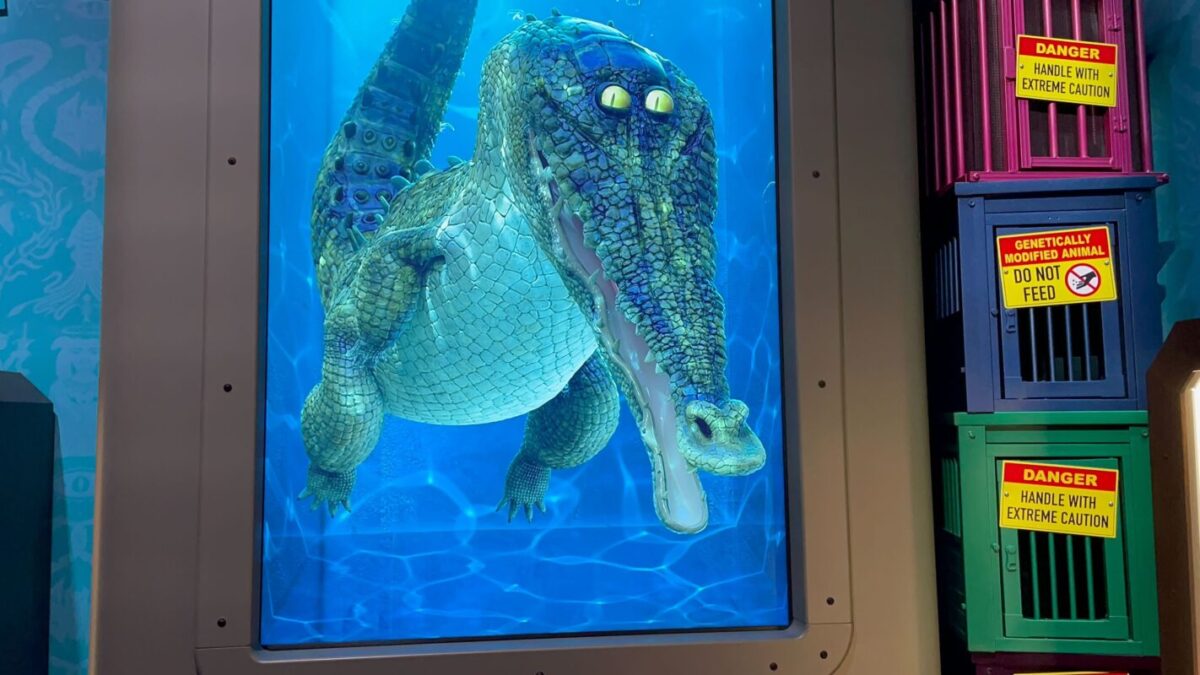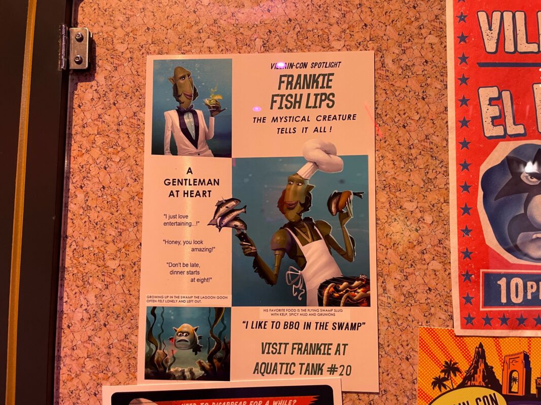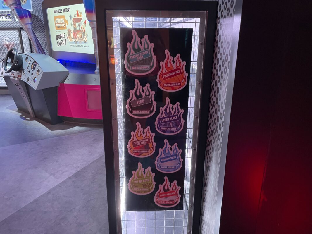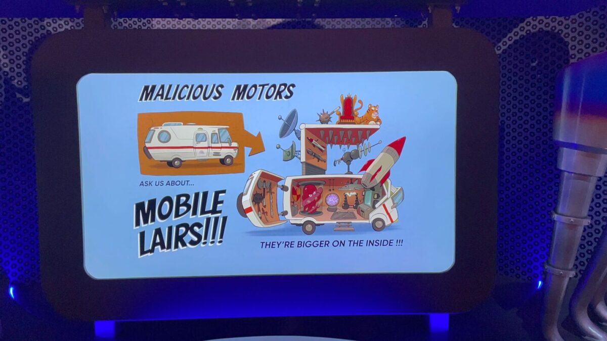 As guests go down a thin hallway, they pass under screens providing exposition for Villain-Con and the ride.