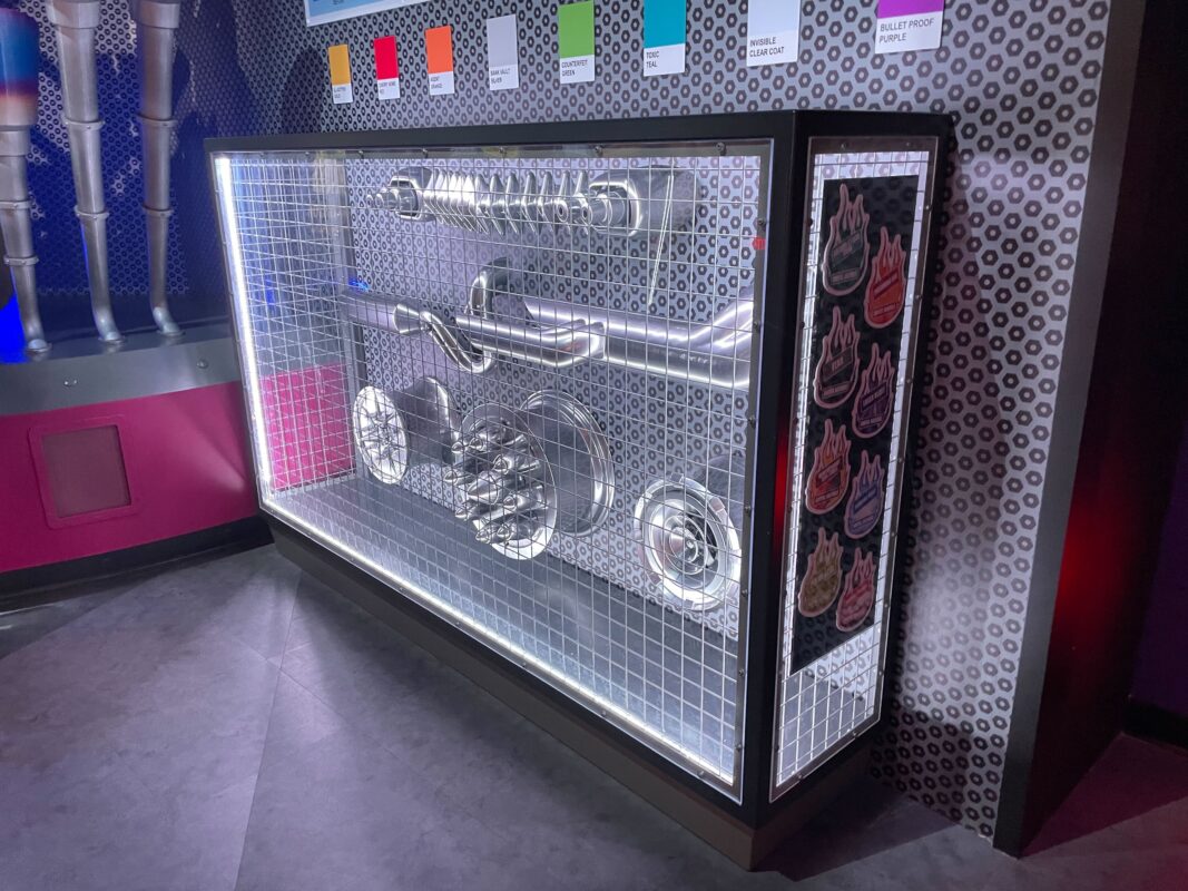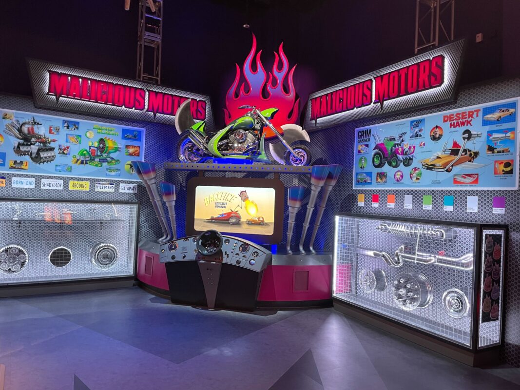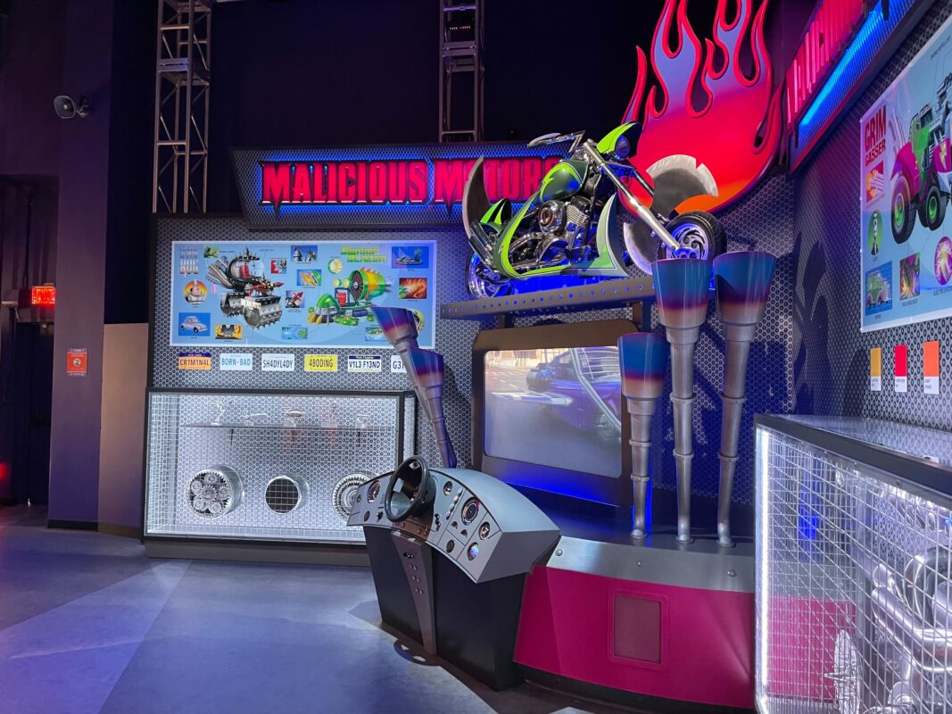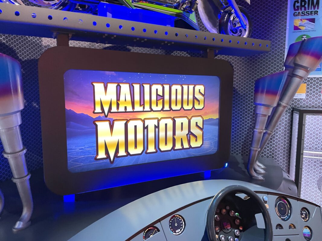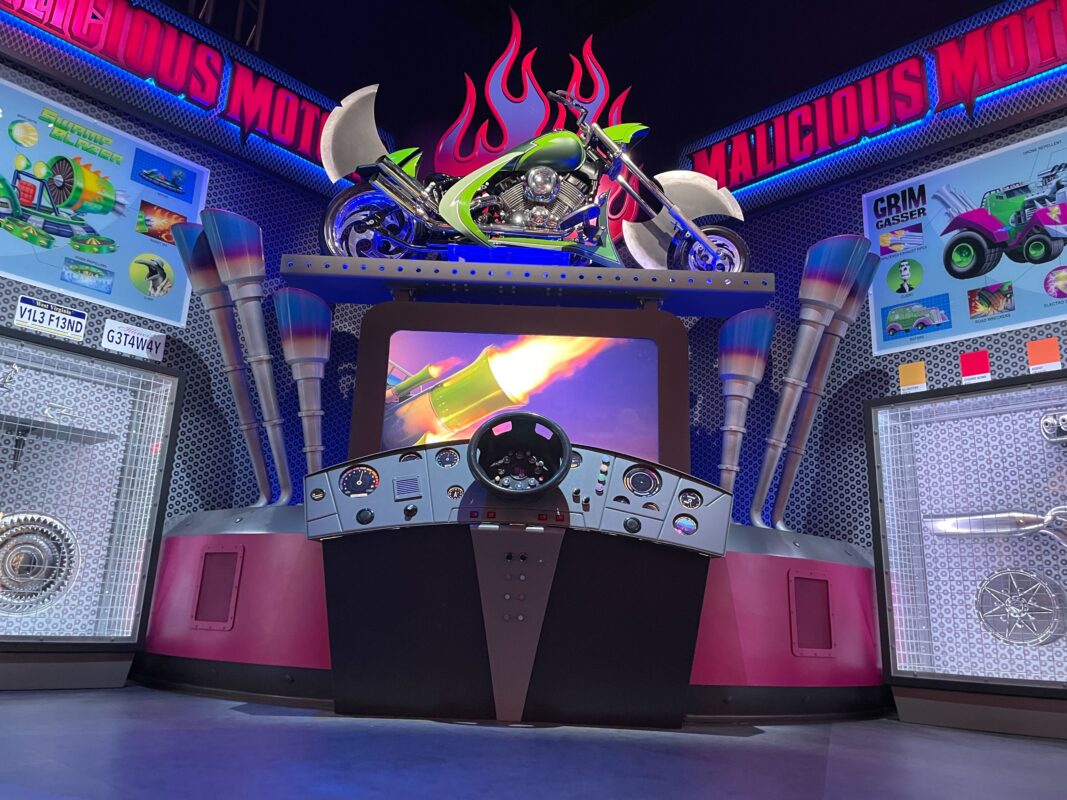 Posters on the purple walls advertise some of the businesses we’ll see later in the queue, including Malicious Motors.