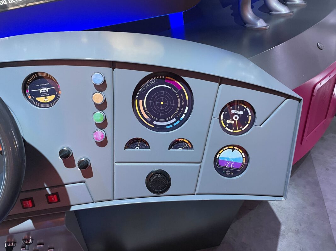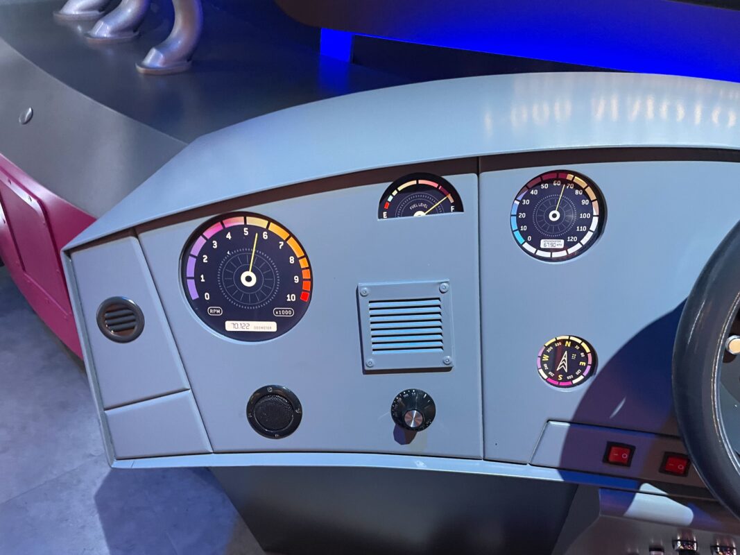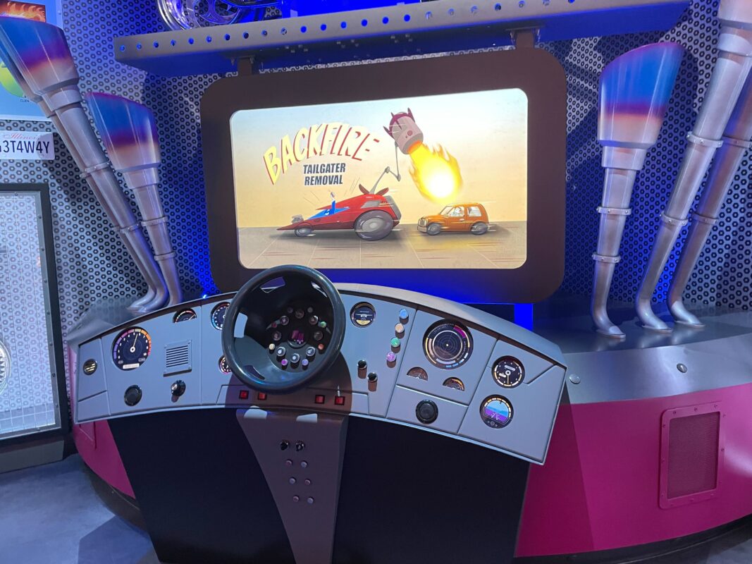 There’s a wheel and dashboard on the booth.