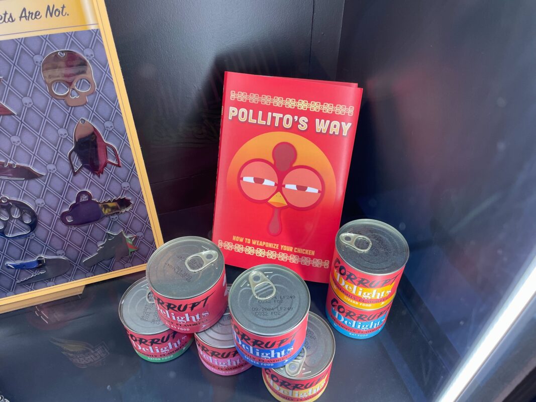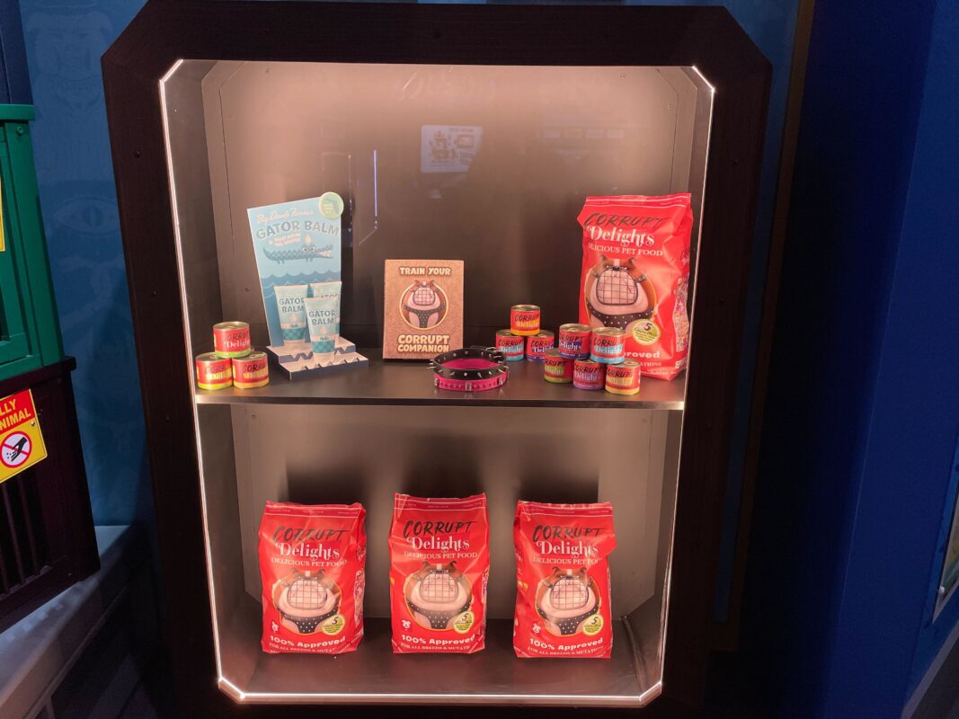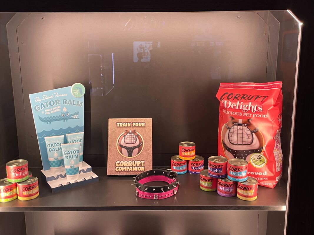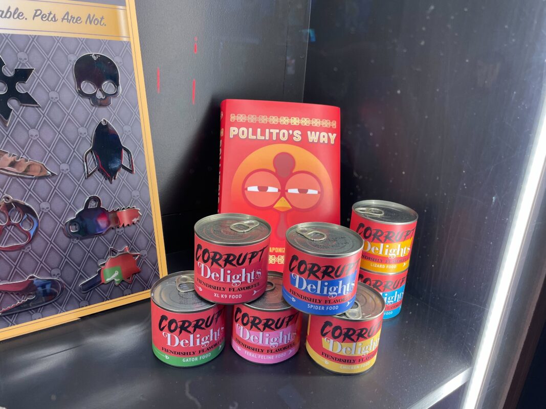 More products are in another display case, including bags of Corrupt Delights food.