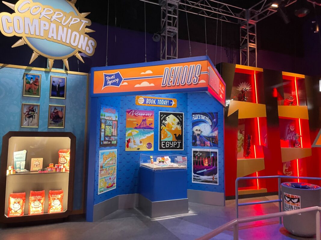 The exhibition hall is full of booths representing various villainous businesses. At the center is a Villain-Con information booth. Upon entering, guests face two boxes. One is for villains to deposit their weapons and another is for lost and found. A screen shows how to use the E-Liminator X.